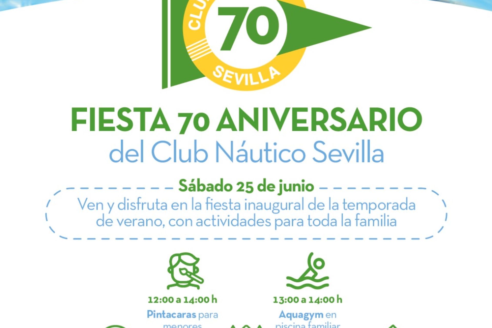 El sábado 25 de junio, coincidiendo con el 70 aniversario de la primera reunión oficial para fundar el Club Náutico Sevilla, ven y disfruta de la fiesta inaugural de la temporada de verano 2022, con actividades programadas para toda la familia desde las 12:00 h. Servicio de ludoteca disponible de 12:00 a 19:30 h.