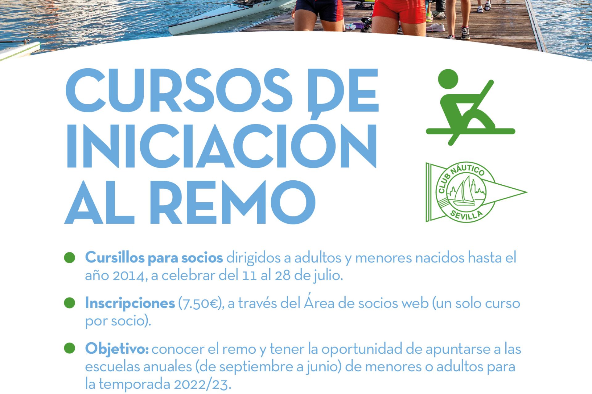 Cursos semanales dirigidos a socios y no socios nacidos entre los años 2007 y 2012, ambos inclusive, a celebrar de lunes a viernes a partir del 6 de junio. Inscripciones, a través del FORMULARIO WEB disponible en clubnauticosevilla.com/piraguismo