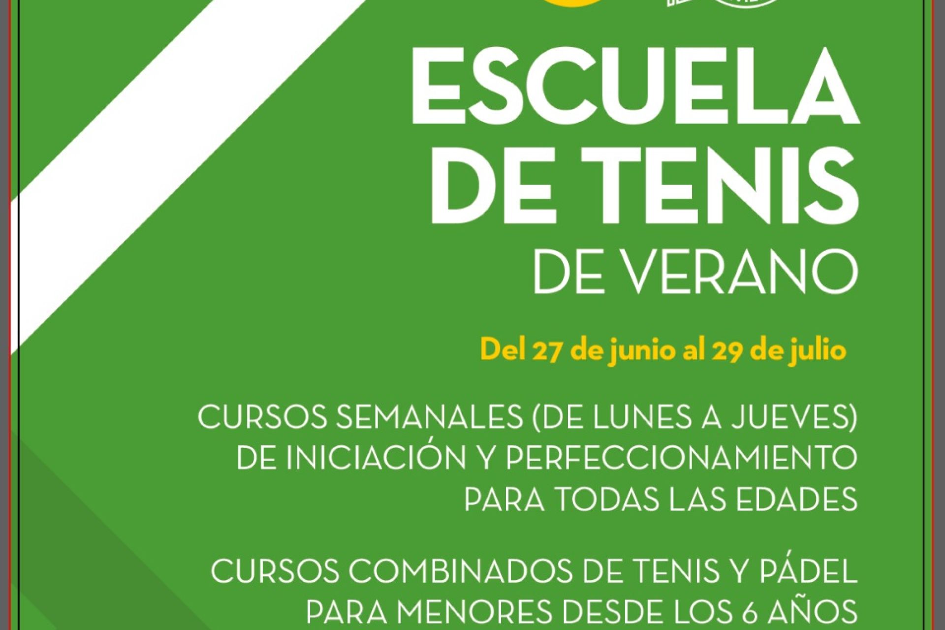 Del 27 de junio al 29 de julio, cursos semanales (de lunes a jueves) de iniciación y perfeccionamiento para todas las edades y cursos combinados de tenis y pádel para menores desde los 6 años. Plazas limitadas. Preinscripciones, a través del formulario web disponible en clubnauticosevilla.com/tenis