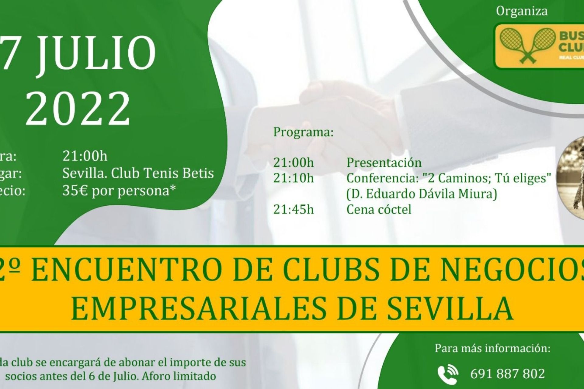 El jueves 7 de julio a las 21:00 horas en el Club Tenis Betis (35€/persona). Aforo limitado. Organiza, Business Club Copa Sevilla. Más información: 691 887 802