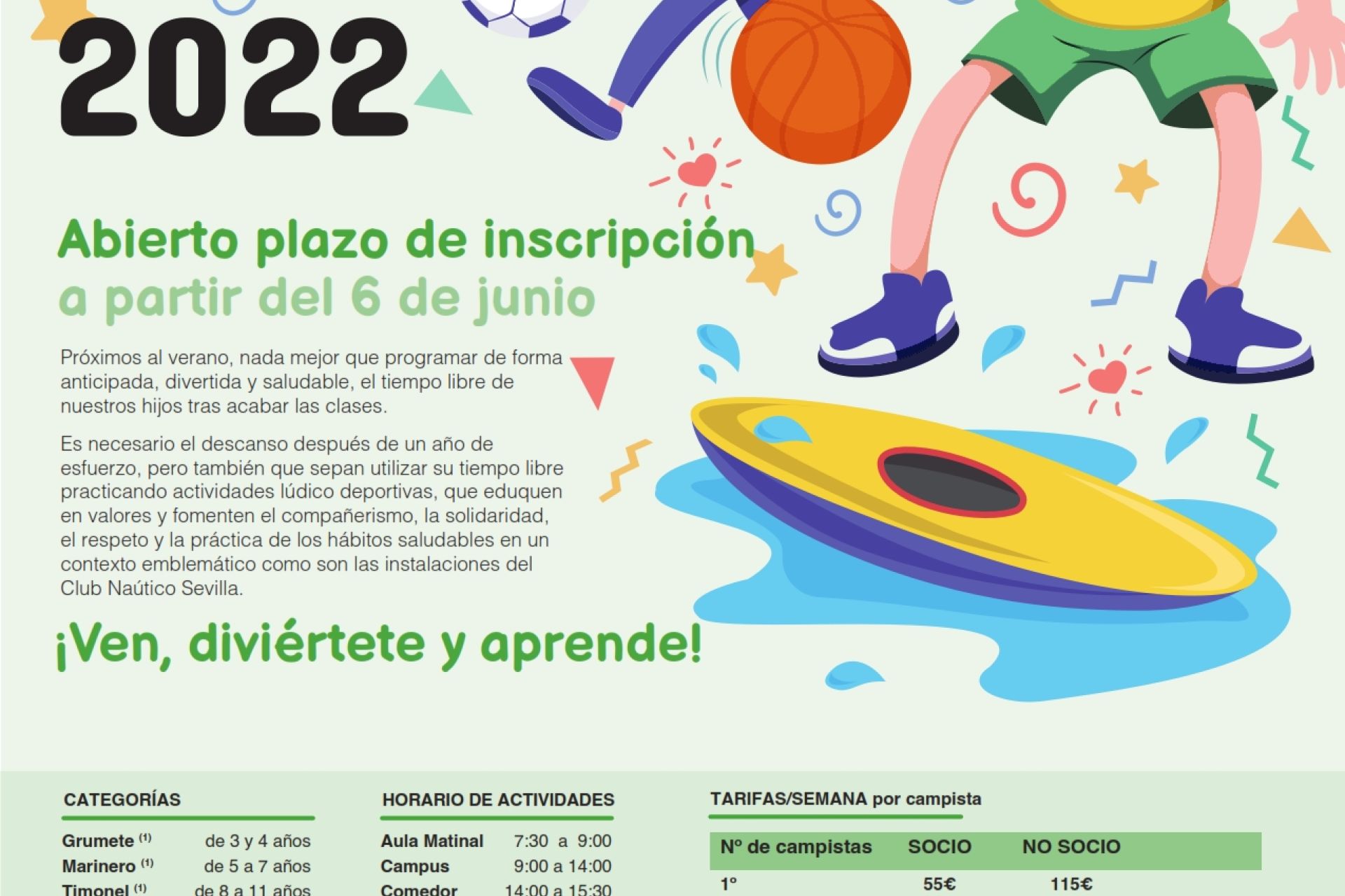 A celebrar del 27 de junio al 9 de septiembre para socios y no socios de 3 a 16 años de edad. Aula matinal, aula de tarde y comedor, opcionales. Inscripciones, en clubnauticosevilla.com/campus-de-verano. Presentación, el lunes 13 de junio a las 19:00 h en el salón social.