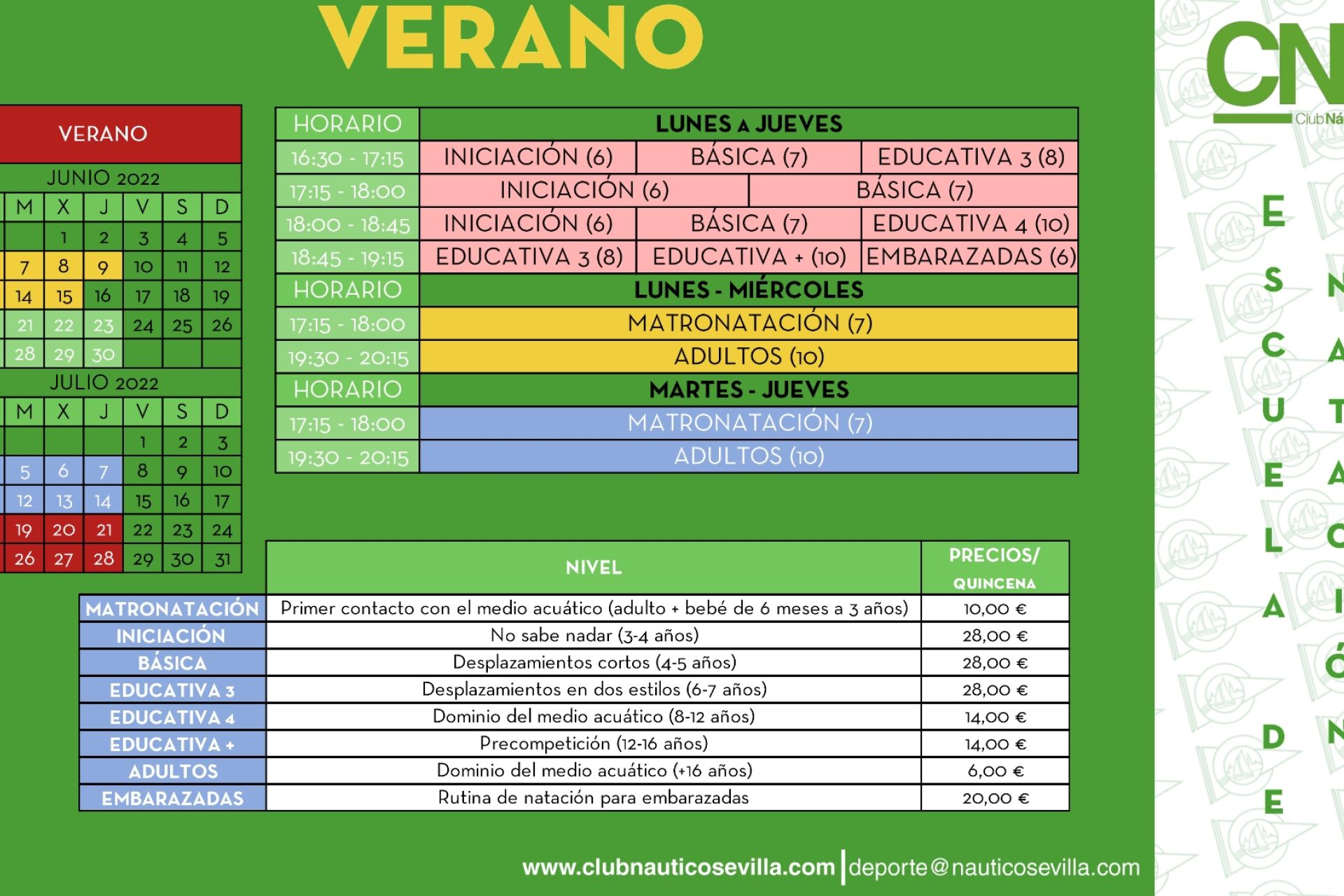 A celebrar del 27 de junio al 9 de septiembre para socios y no socios de 3 a 16 años de edad. Aula matinal, aula de tarde y comedor, opcionales. Inscripciones, a partir del lunes 6 de junio en clubnauticosevilla.com/campus-de-verano. Presentación, lunes 13 de junio a las 19:00 h en el salón social.