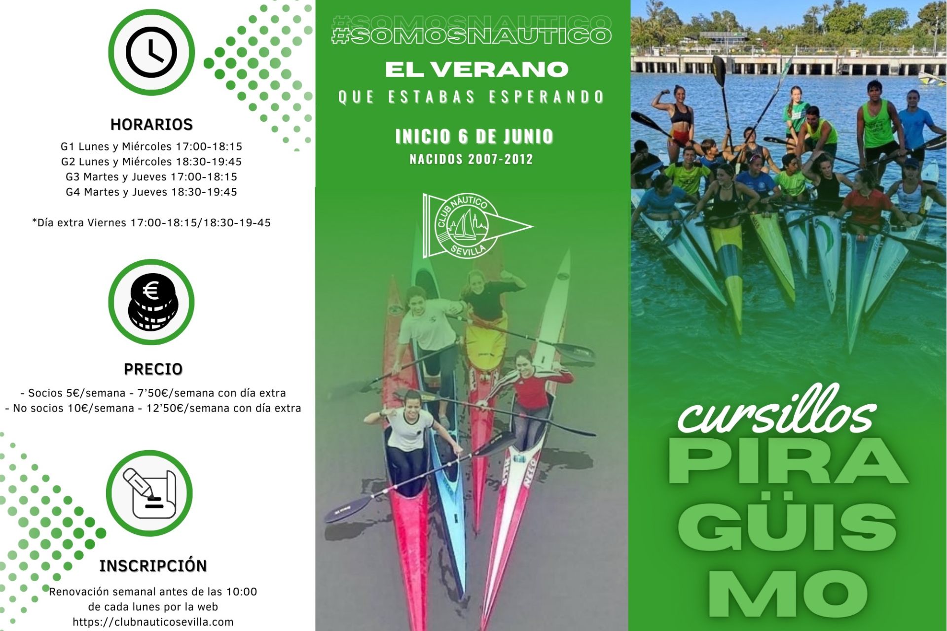 Cursos semanales dirigidos a socios y no socios nacidos entre los años 2007 y 2012, ambos inclusive, a celebrar de lunes a viernes a partir del 6 de junio. Inscripciones, a través del FORMULARIO WEB disponible en clubnauticosevilla.com/piraguismo