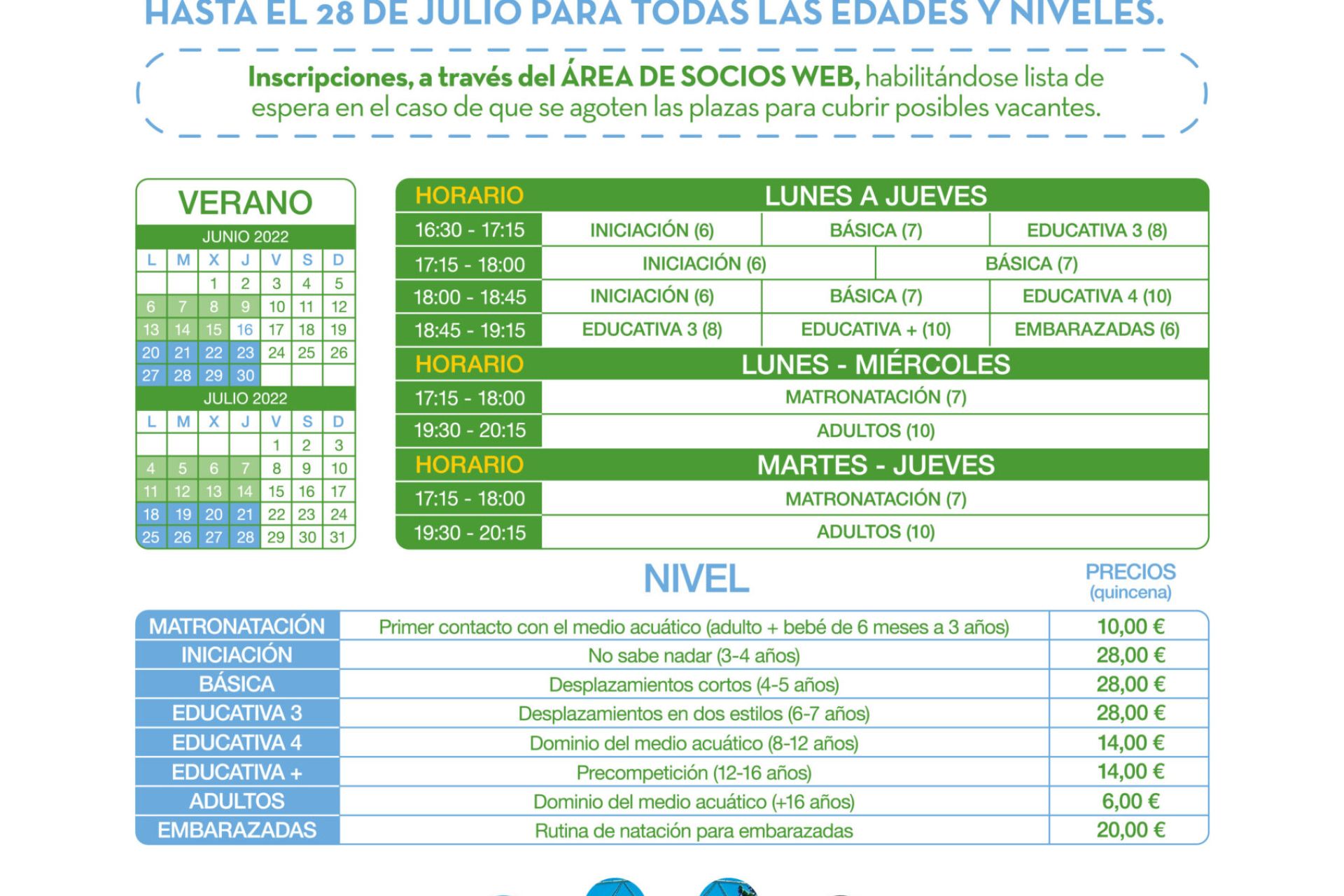 Cursos quincenales programados, de lunes a jueves, del 6 de junio al 28 de julio para todas las edades y niveles. Inscripciones, a partir de las 12:00 h del lunes 23 de mayo a través del ÁREA DE SOCIOS WEB