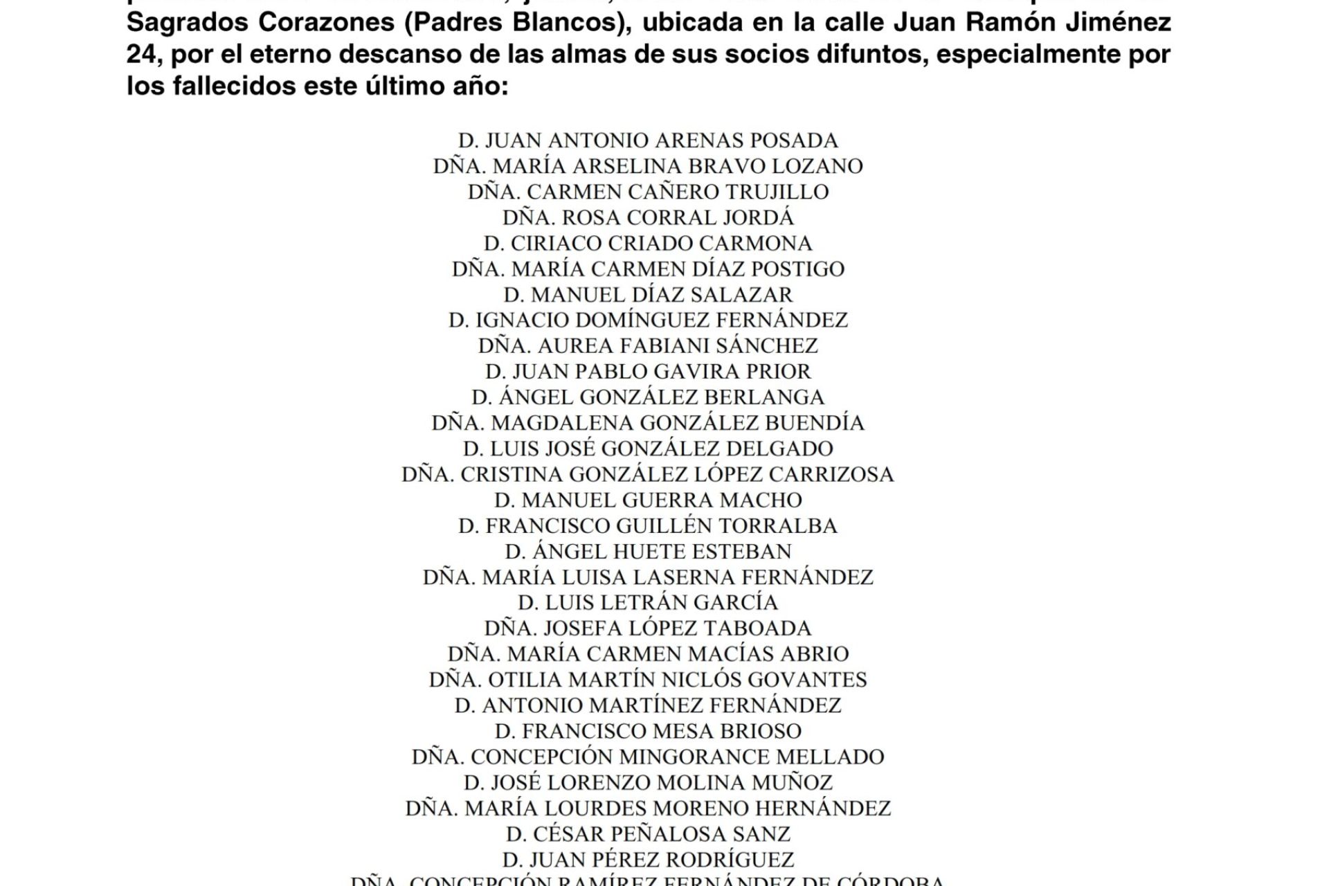 Este jueves, 6 de noviembre, a las 19:30 horas en la Parroquia de los Sagrados Corazones (Padres Blancos, c/ Juan Ramón Jiménez 24) en recuerdo de los socios difuntos de la entidad, especialmente por los fallecidos el último año.