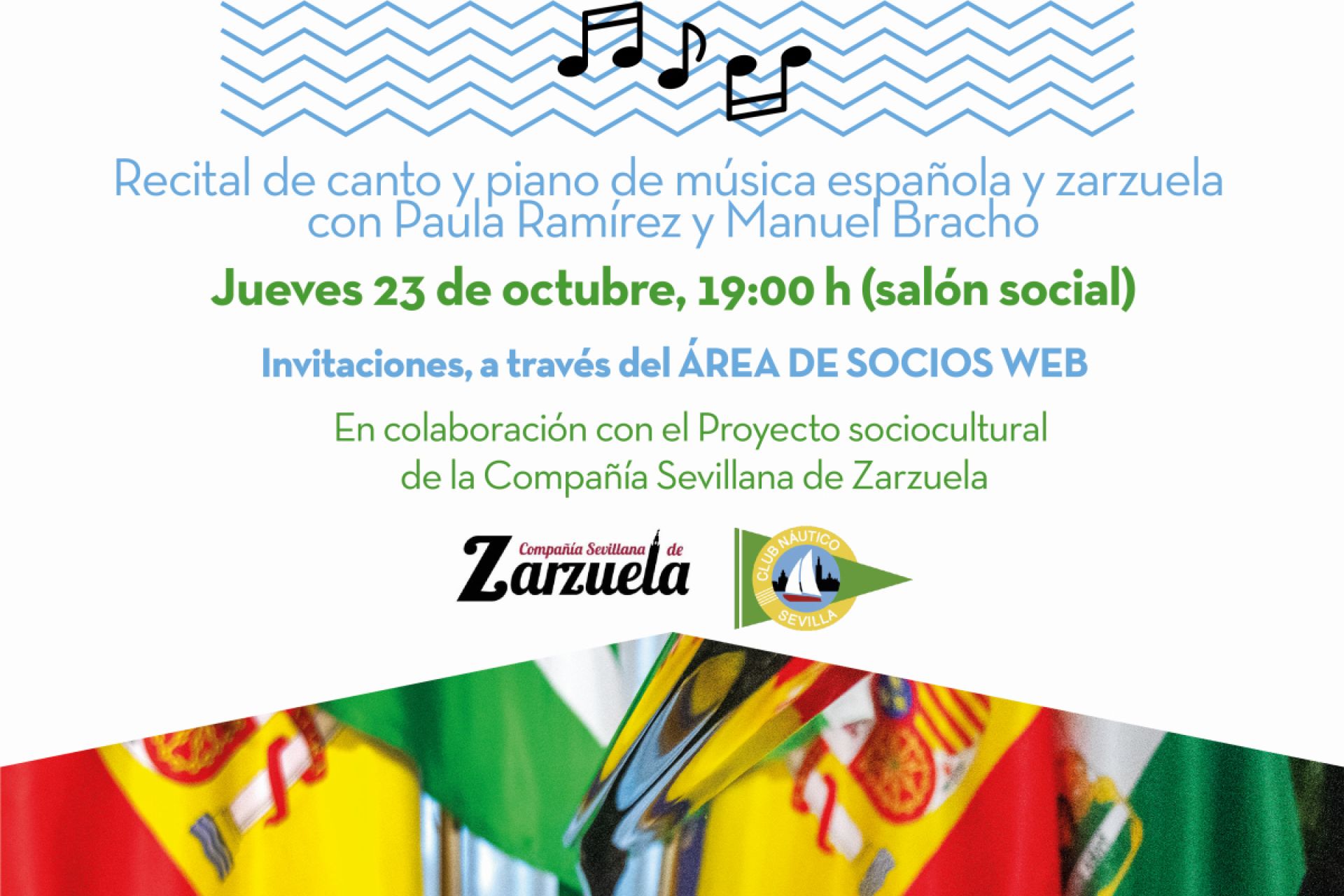 La nueva temporada cultural se inicia este jueves, 23 de octubre, a las 19:00 horas en el salón social con un recital de canto y piano de música española y zarzuela con Paula Ramírez y Manuel Bracho, organizado en colaboración con el Proyecto sociocultural de la Compañía Sevillana de Zarzuela.