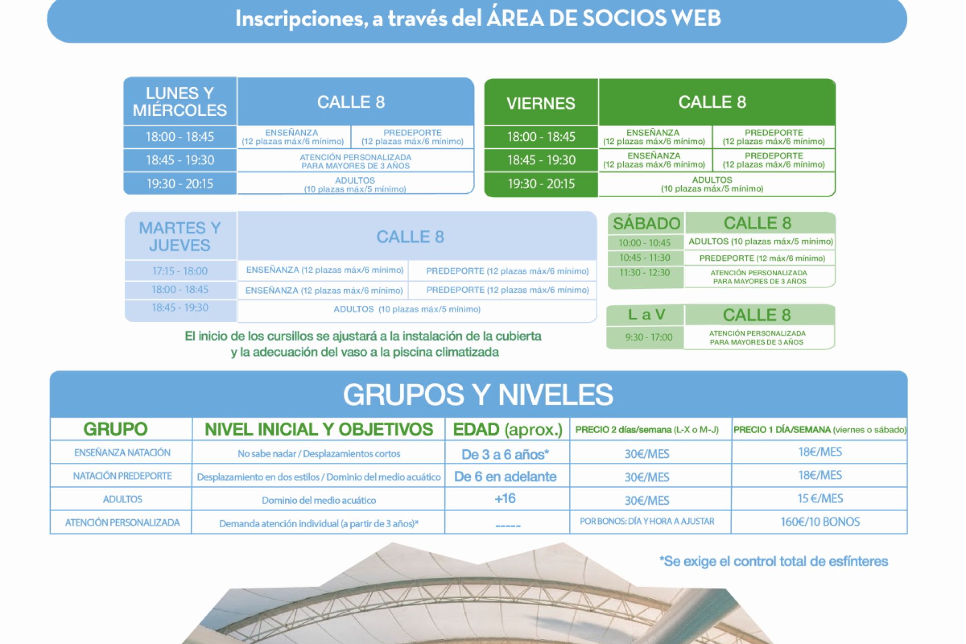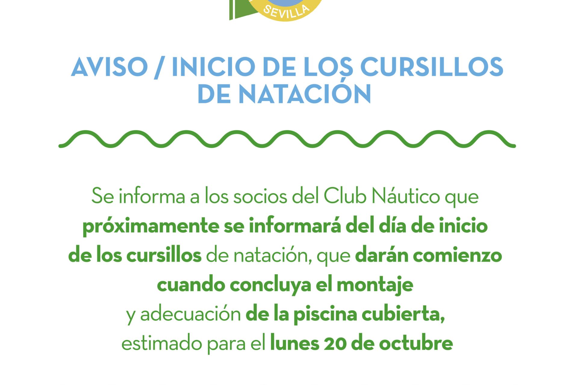 Se informa a los socios del Club Náutico que próximamente se informará del día de inicio de los cursillos de natación, que darán comienzo cuando concluya el montaje y adecuación de la piscina cubierta, estimado para el lunes 20 de octubre.
