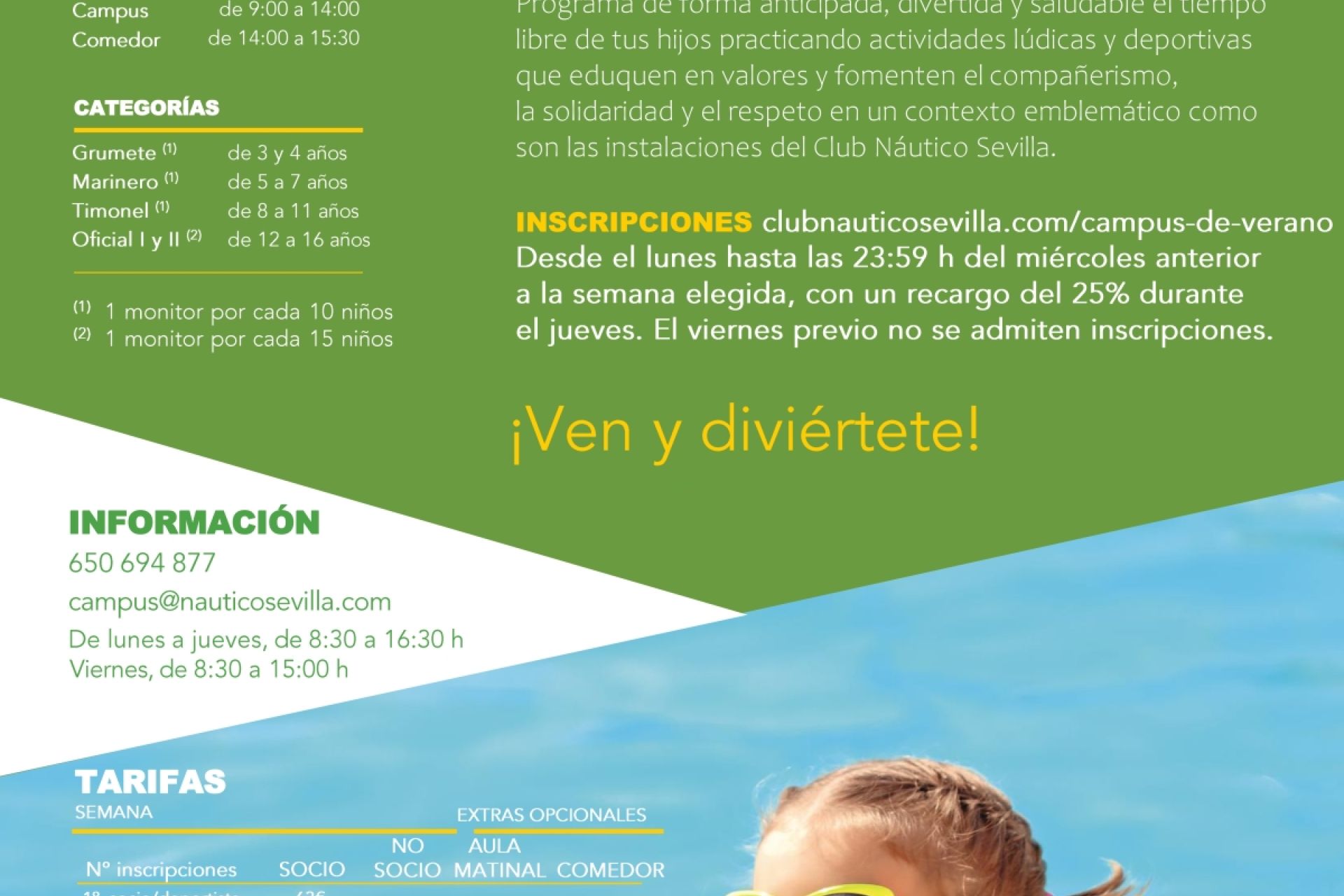Del 24 de junio al 5 de septiembre para socios y no socios de 3 a 16 años de edad. Aula matinal y comedor, opcionales. Las inscripciones, semanales, se cerrarán el miércoles previo a la semana elegida a las 23:59 h.