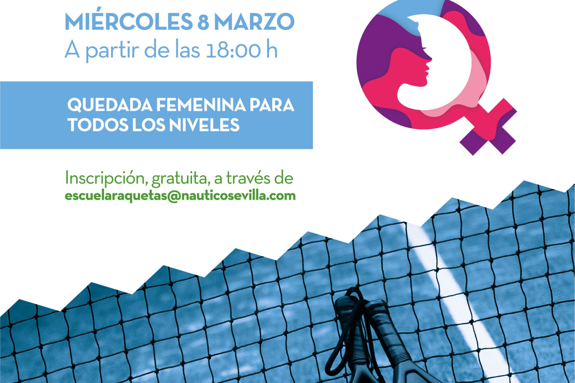 Quedada femenina para todos los niveles a celebrar en el Club Náutico el miércoles 8 de marzo a partir de las 18:00 horas. Inscripciones, gratuitas, a través de escuelaraquetas@nauticosevilla.com ¡No faltes!