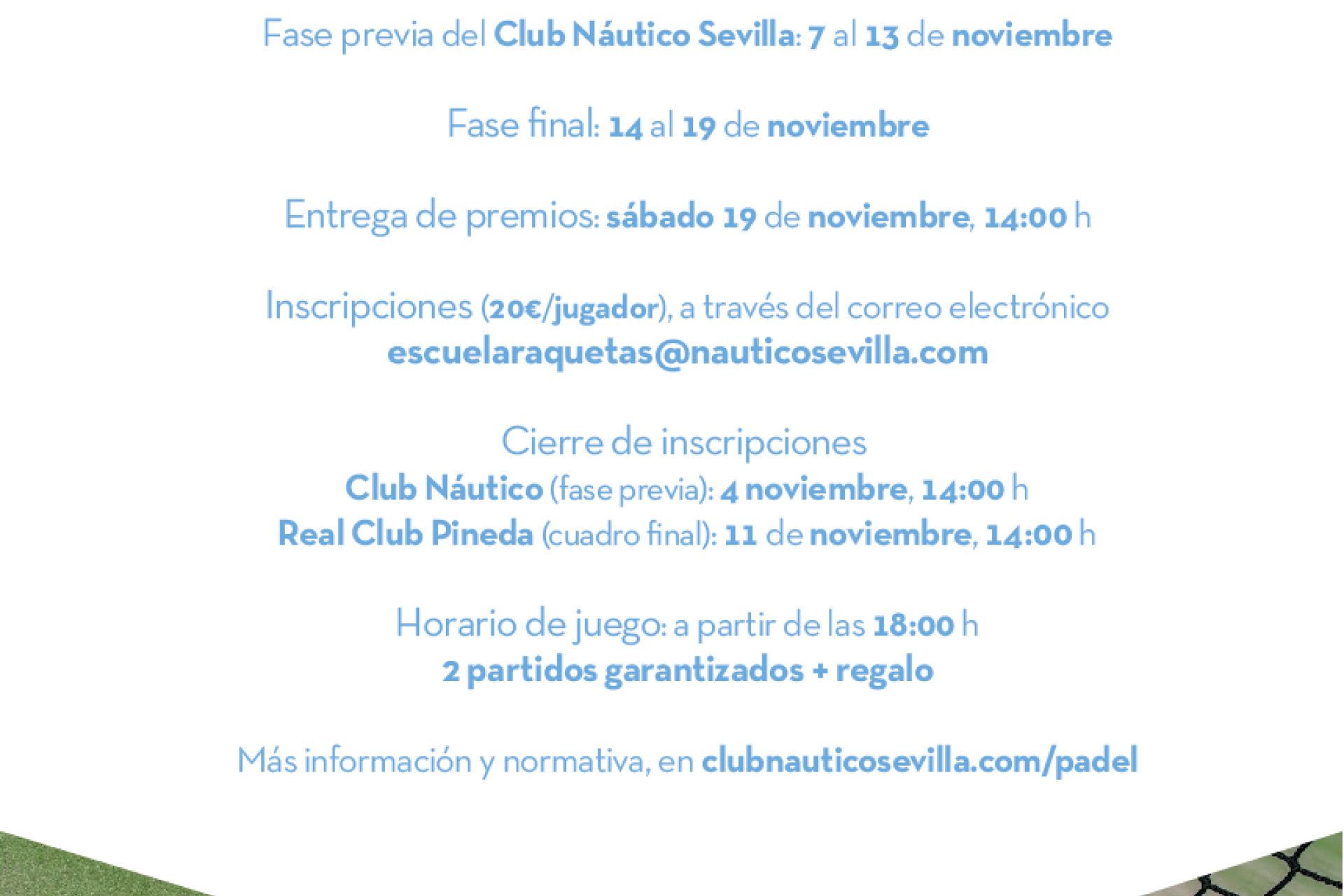 Abierto el plazo de inscripción para la competición a celebrar en el Club Náutico Sevilla del 29 de noviembre al 5 de diciembre con la participación, en calidad de invitado, del Real Club Pineda. Días 27 y 28, fase previa exclusiva para los socios del Náutico. Categorías masculina y femenina. Plazas limitadas. Inscripciones (15€), a través de deporte@nauticosevilla.com