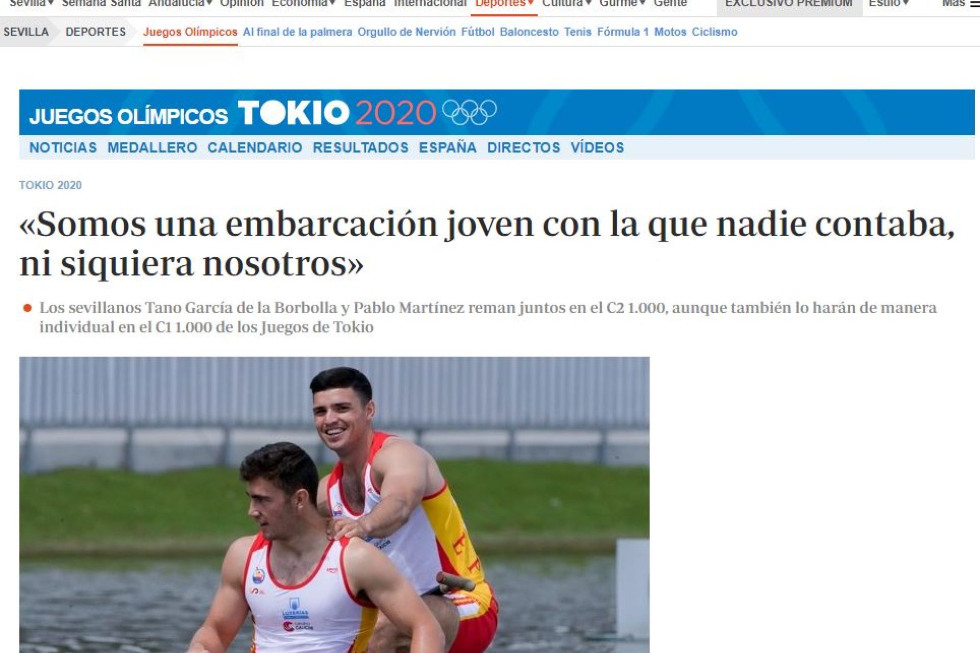 Entrevista publicada en ABC de Sevilla a los palistas olímpicos del Club Náutico Cayetano García de la Borbolla y Pablo Martínez, que debutan en los Juegos de Tokio este lunes en C-2 1.000. Por Sergio Ávila.