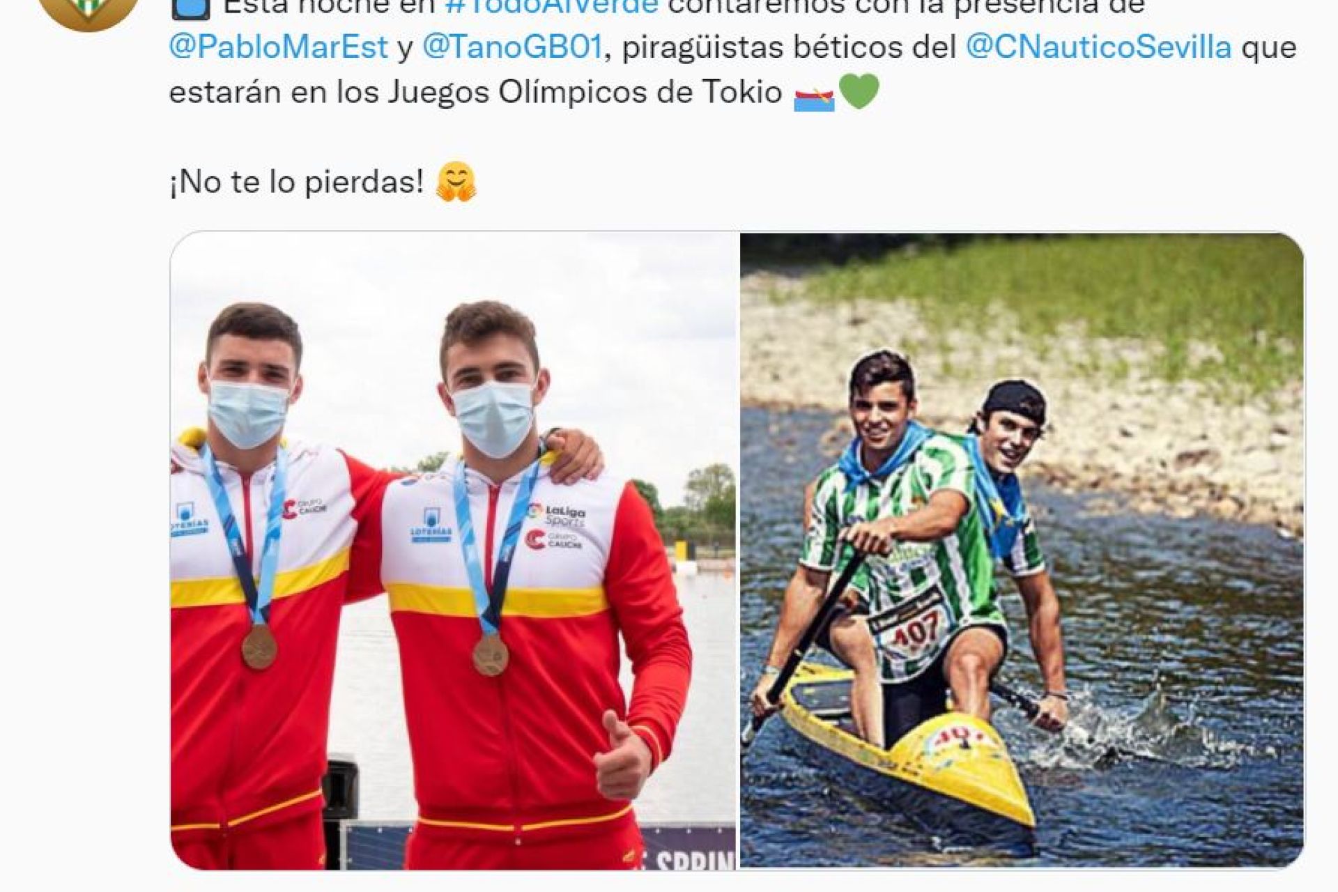 Los canoístas del Club Náutico Sevilla Cayetano García de la Borbolla y Pablo Martínez, clasificados para los Juegos Olímpicos de Tokio en la prueba de C-2 1.000 metros, entrevistados en el programa ‘Todo al verde’ de la Televisión oficial del Real Betis Balompié.