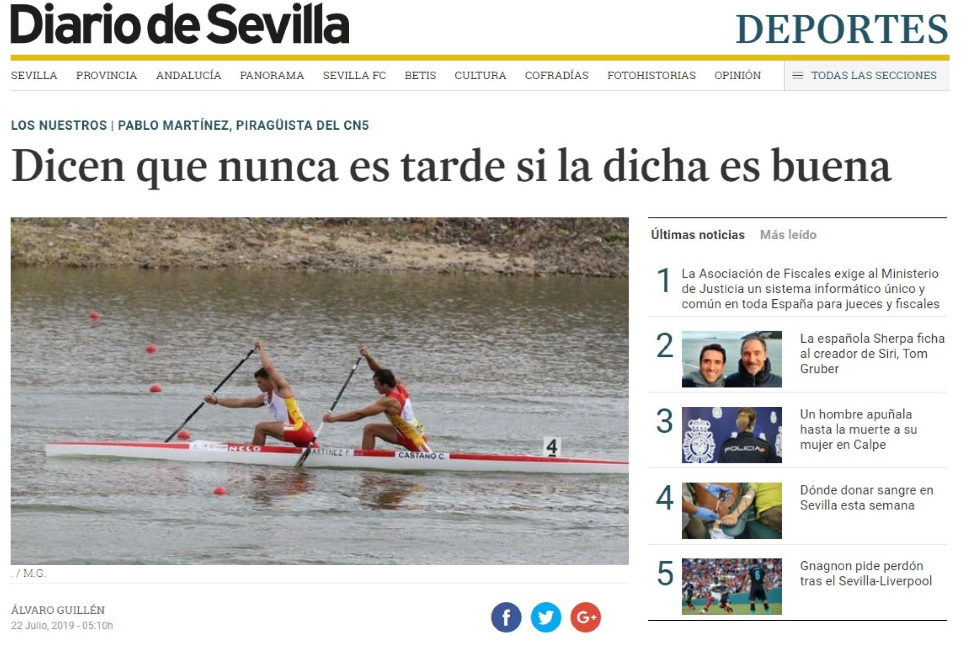 Reportaje publicado en la sección ‘Los nuestros’ de Diario de Sevilla sobre el palista internacional del Club Náutico Pablo Martínez, que este año ha debutado con la selección en el Europeo sub23. Por Álvaro Guillén.