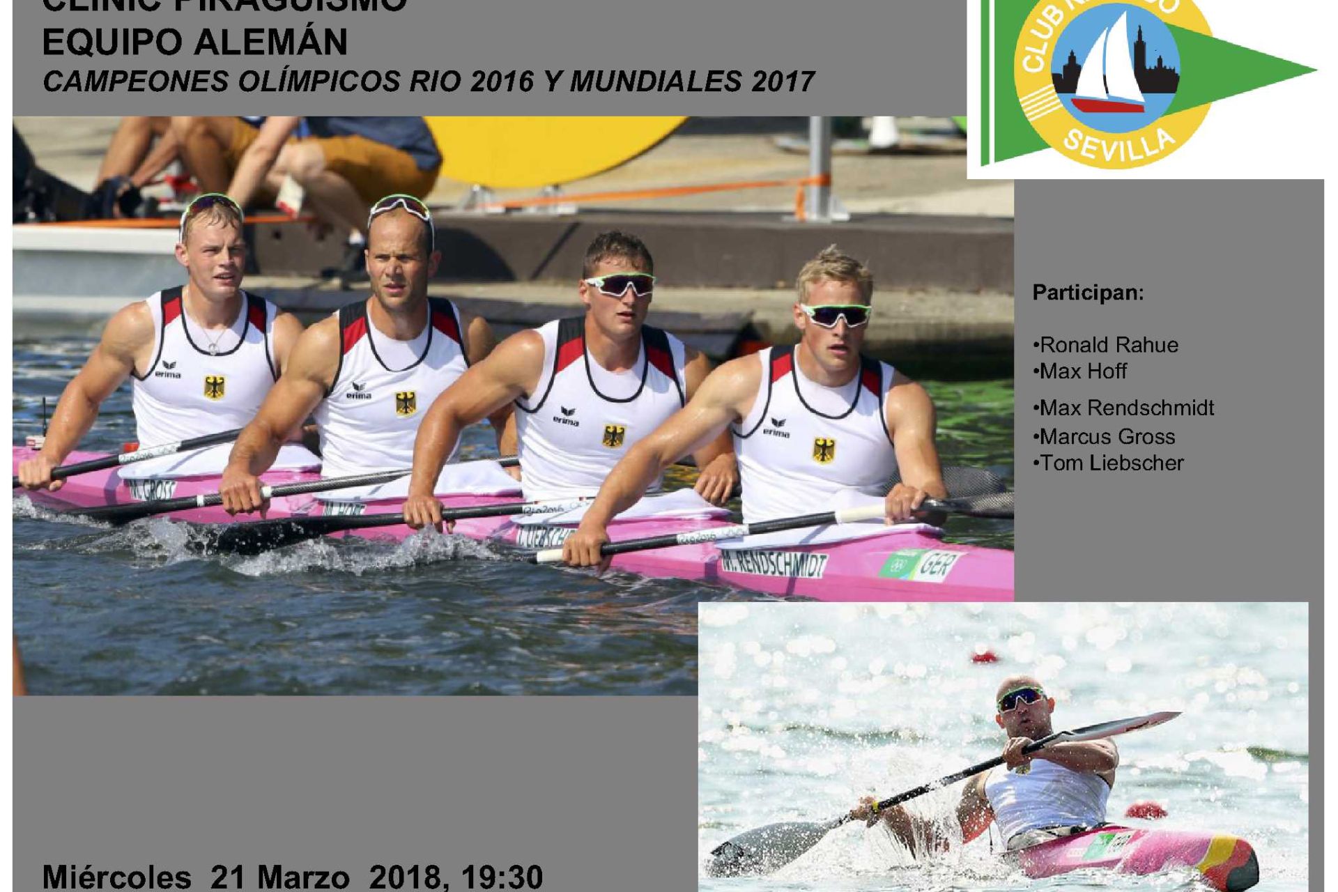 Los salones sociales del Club Náutico Sevilla acogerán el miércoles 21 de marzo un clínic del equipo olímpico alemán de piragüismo. El acto, abierto al público en general, está previsto que se inicie a las 19:30 horas con la presencia de los multimedallistas olímpicos y mundiales Max Rendschmidt, Tom Liebscher, Max Hoff, Marcus Gross y Ronald Rahue, que entre otros logros han subido a lo más alto del podio tanto en los pasados Juegos Olímpicos de Río de Janeiro como en el Campeonato del Mundo de 2017.