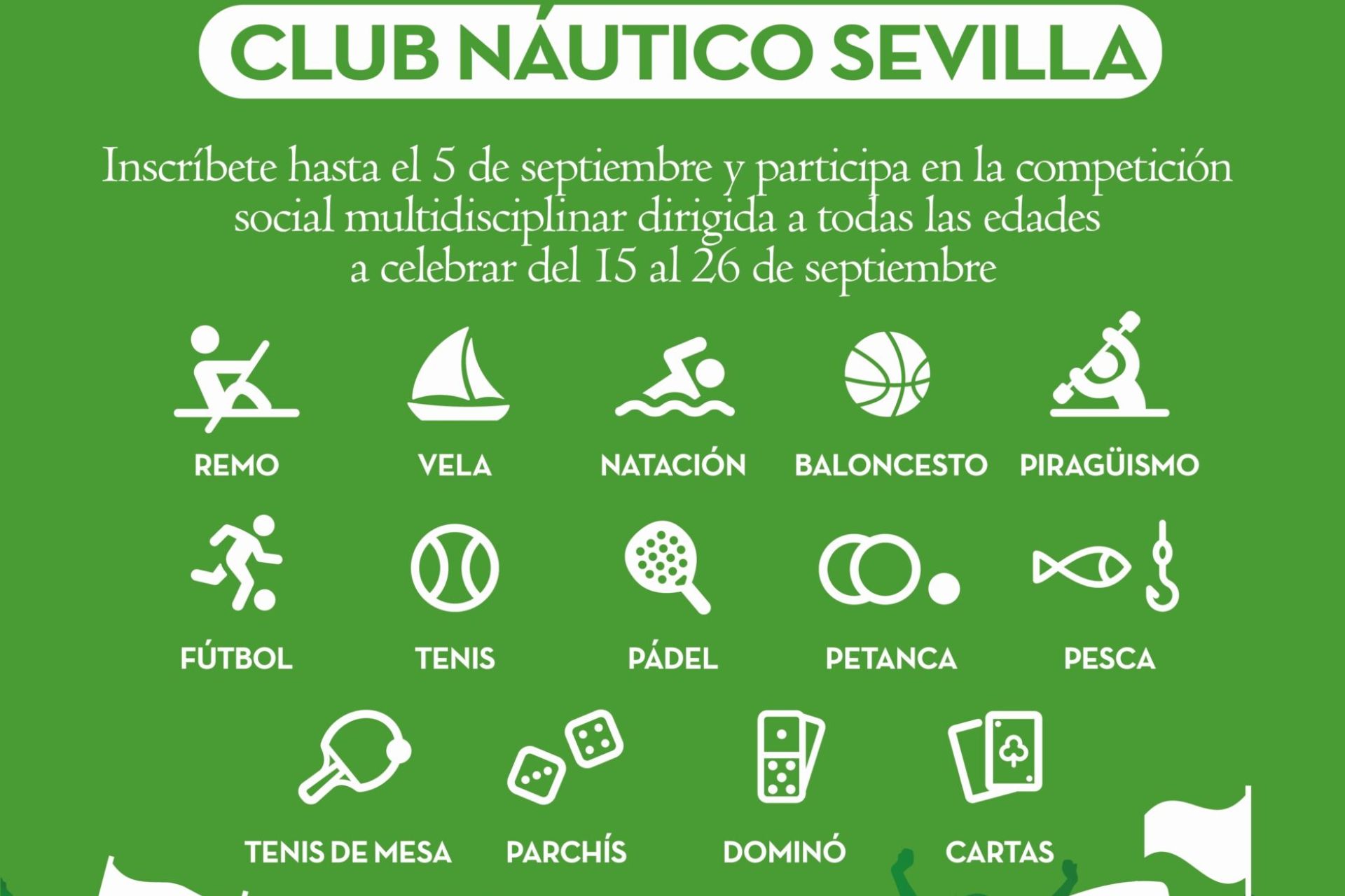 Abierto el plazo de inscripción, hasta el 5 de septiembre, para la competición social interdisciplinar a celebrar en el Club Náutico para despedir la temporada de verano del 15 al 26 de septiembre. Inscripciones (5€ + camiseta y dos consumisiones para la clausura, el sábado 27 de septiembre), a través de FORMULARIO WEB.