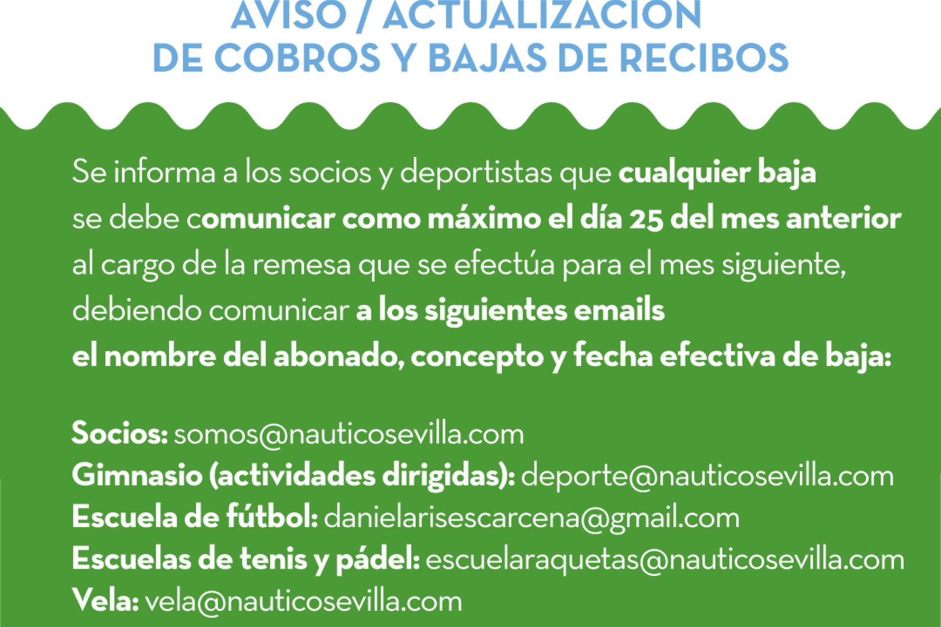 Se informa a los socios y deportistas que cualquier baja se debe comunicar como máximo el día 25 del mes anterior al cargo de la remesas que se efectúa para el mes siguiente, debiendo comunicar por email el nombre del abonado, concepto y fecha efectiva de baja.