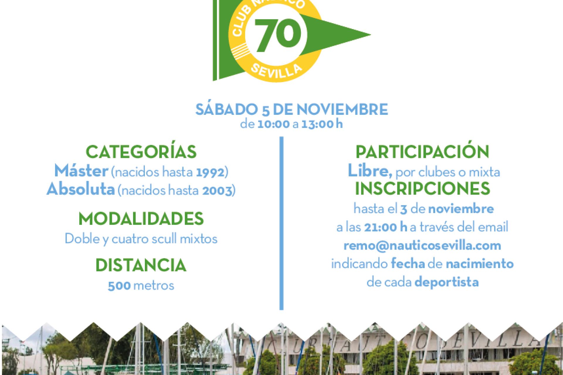 Este jueves, 3 de noviembre, a las 21:00 h acaba el plazo de inscripción, a realizar a través del email remo@nauticosevilla.com indicando fecha de nacimiento de cada deportista, para la competición a celebrar el sábado 5 (10:00 a 13:00 h) en las categorías absoluta (nacidos hasta 2003) y Máster (hasta 1992) sobre 500 metros en doble y cuatro scull mixtos.