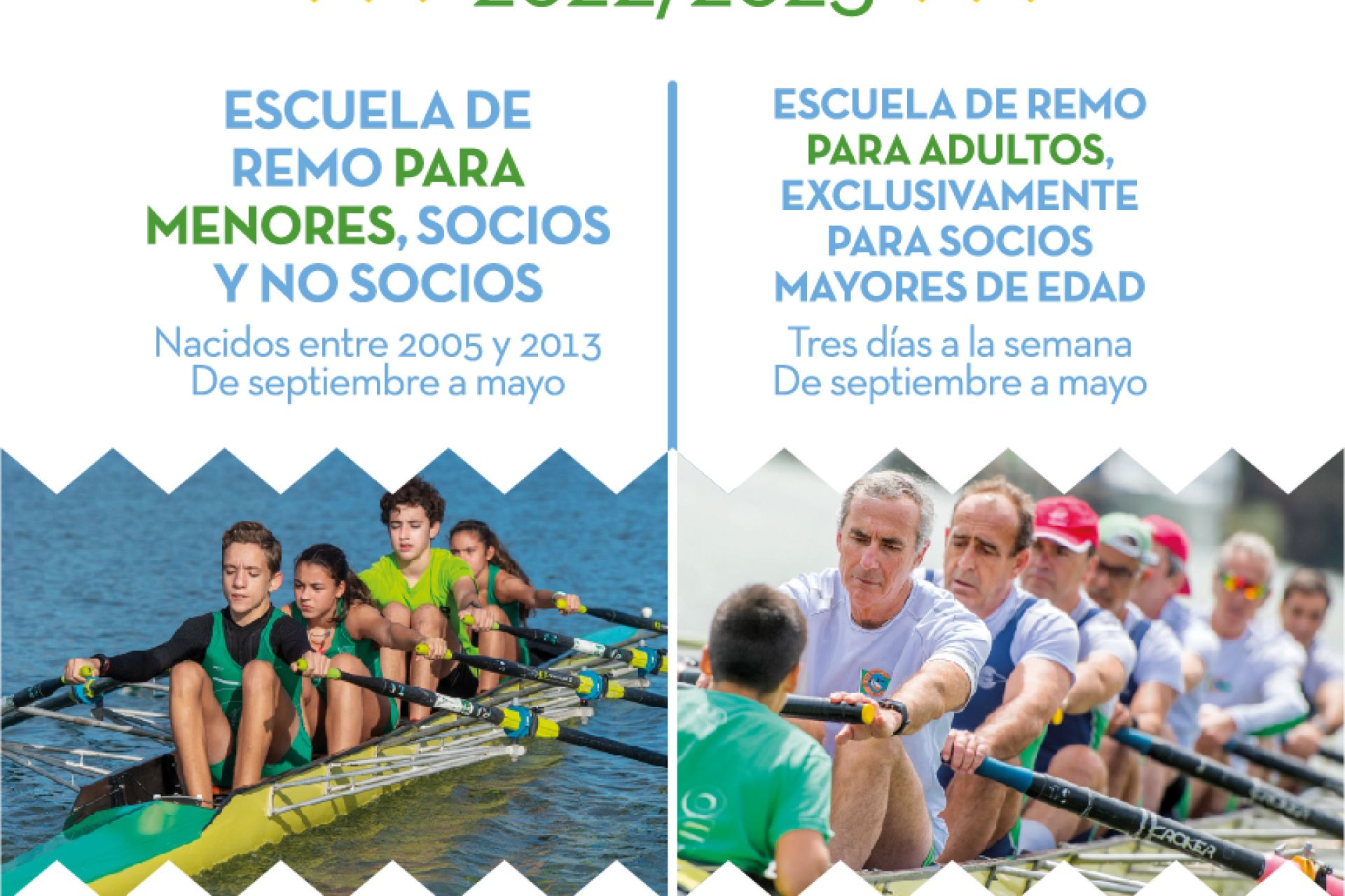 Escuelas a desarrollar de septiembre a mayo para socios y no socios menores de edad nacidos entre los años 2005 y 2013 y socios adultos. Estos últimos también pueden recibir clases personalizadas de remo de forma individual o en grupos durante todo el año.