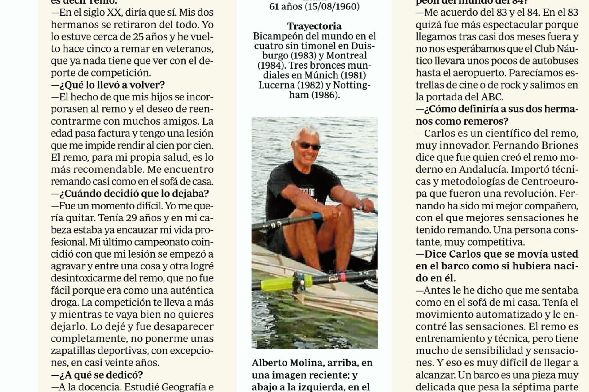 Entrevista al bicampeón mundial y doble medallista de bronce intercontinental de remo del Club Náutico Sevilla publicada en ABC de Sevilla. Por Sergio Ávila.