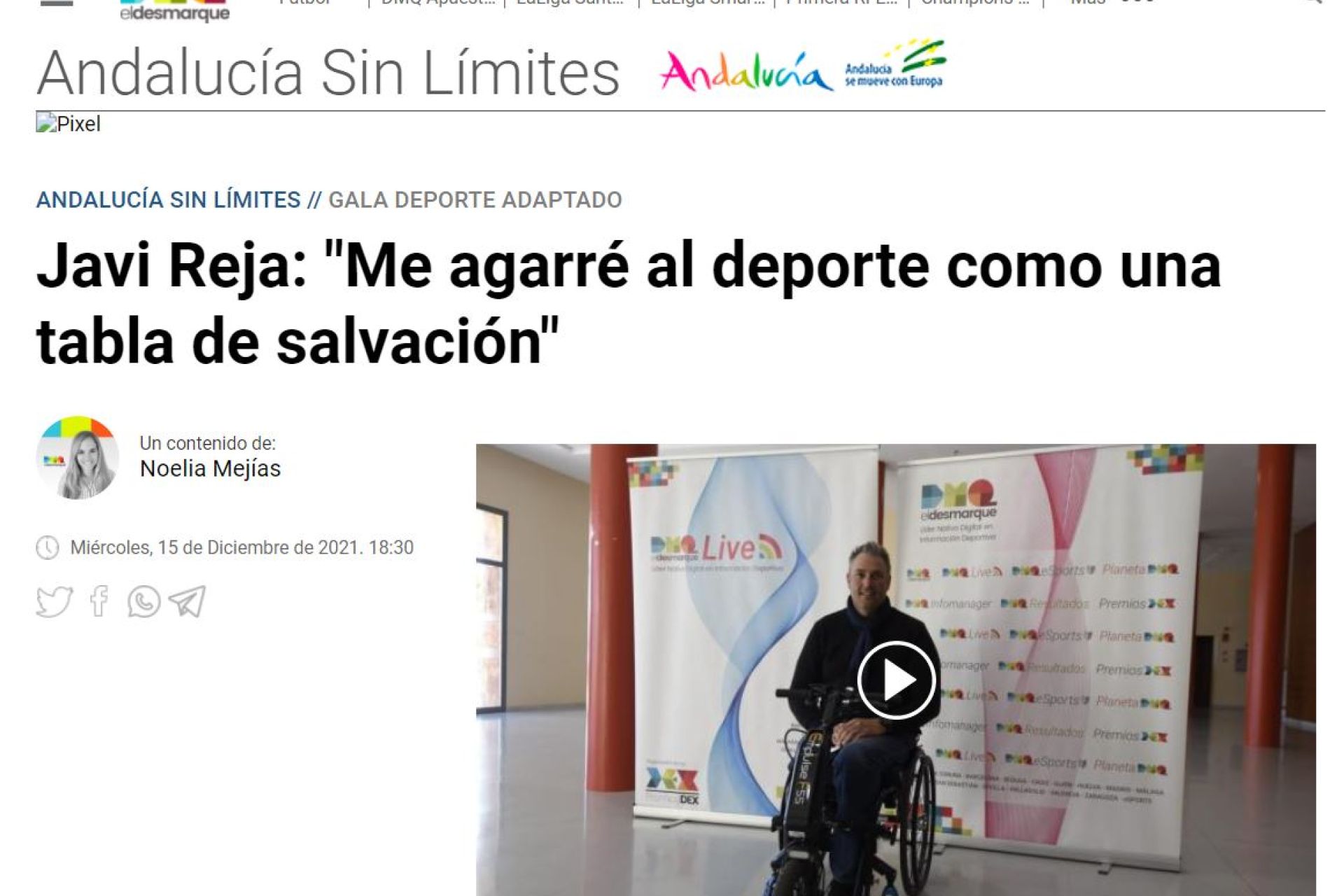 Reportaje publicado en el portal El Desmarque sobre el deportista paralímpico del Club Náutico, "una auténtica lección de vida" que en los pasado Juegos de Tokio acariciaba la medalla en remo adaptado.