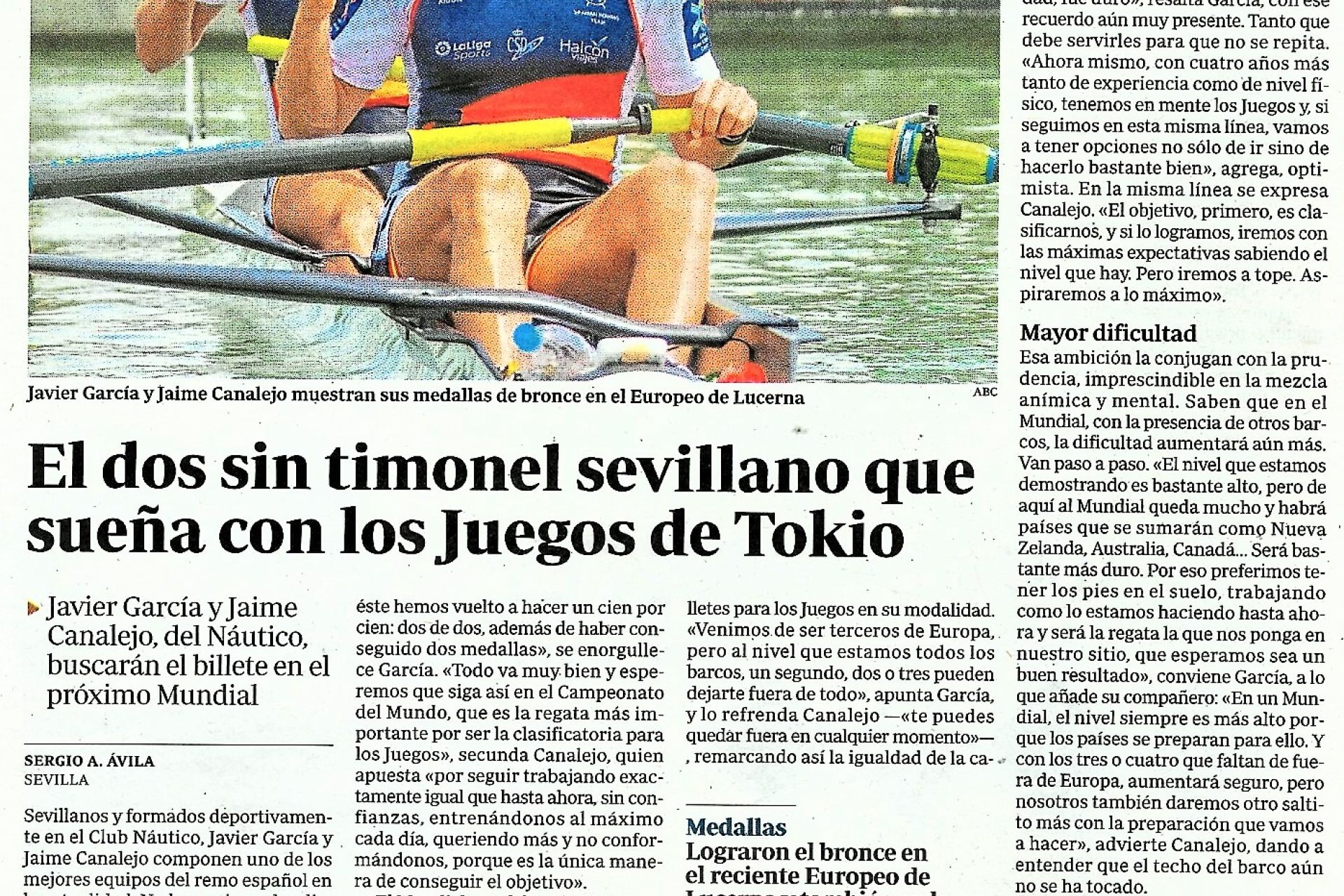 Reportaje publicado en ABC Sevilla sobre los remeros del Club Náutico Javier García y Jaime Canalejo, bronce en la Copa del Mundo y el Campeonato de Europa esta temporada y que buscarán el pasaporte olímpico en el Mundial de este verano. Por Sergio Ávila.