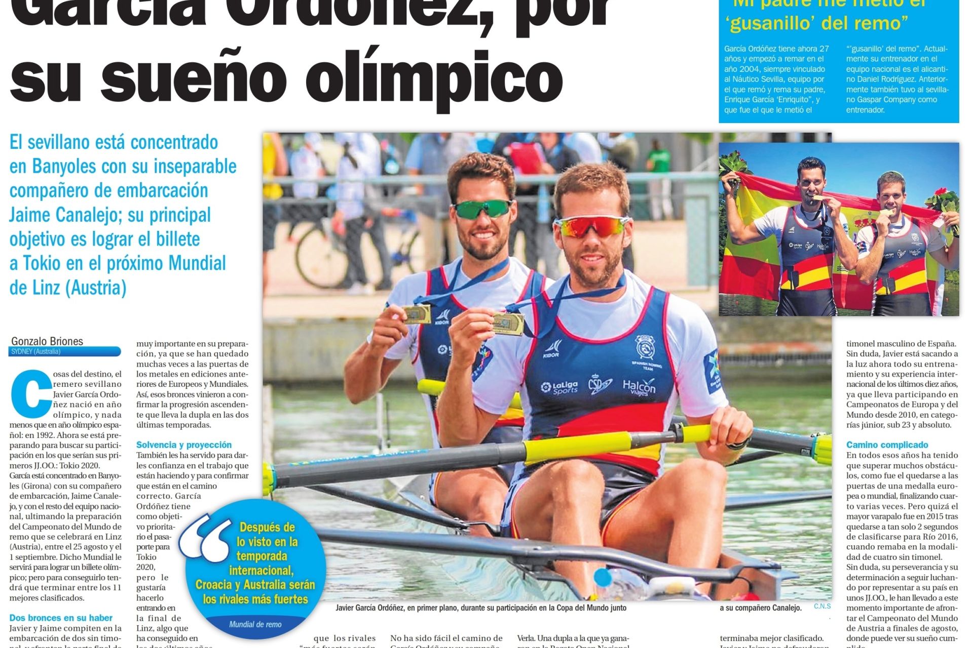 Reportaje publicado en el diario ‘Estadio Deportivo’ sobre el remero internacional del Náutico Javier García, que junto a su compañero de club Jaime Canalejo está llamado a lograr el billete olímpico para Tokio la semana próxima en el Mundial de Linz (Austria). Por Gonzalo Briones.