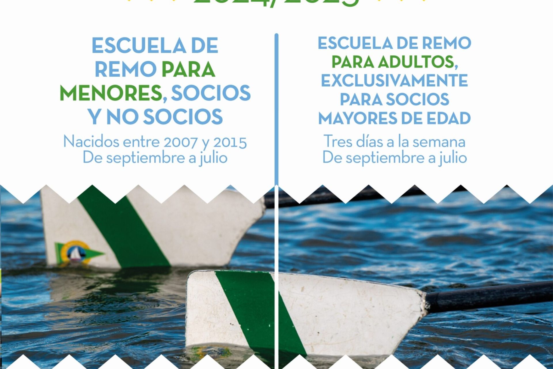 Escuelas a desarrollar de septiembre a julio para socios y no socios menores de edad nacidos entre los años 2007 y 2015 y socios adultos. Estos últimos también pueden recibir clases personalizadas de remo de forma individual o en grupos durante todo el año.