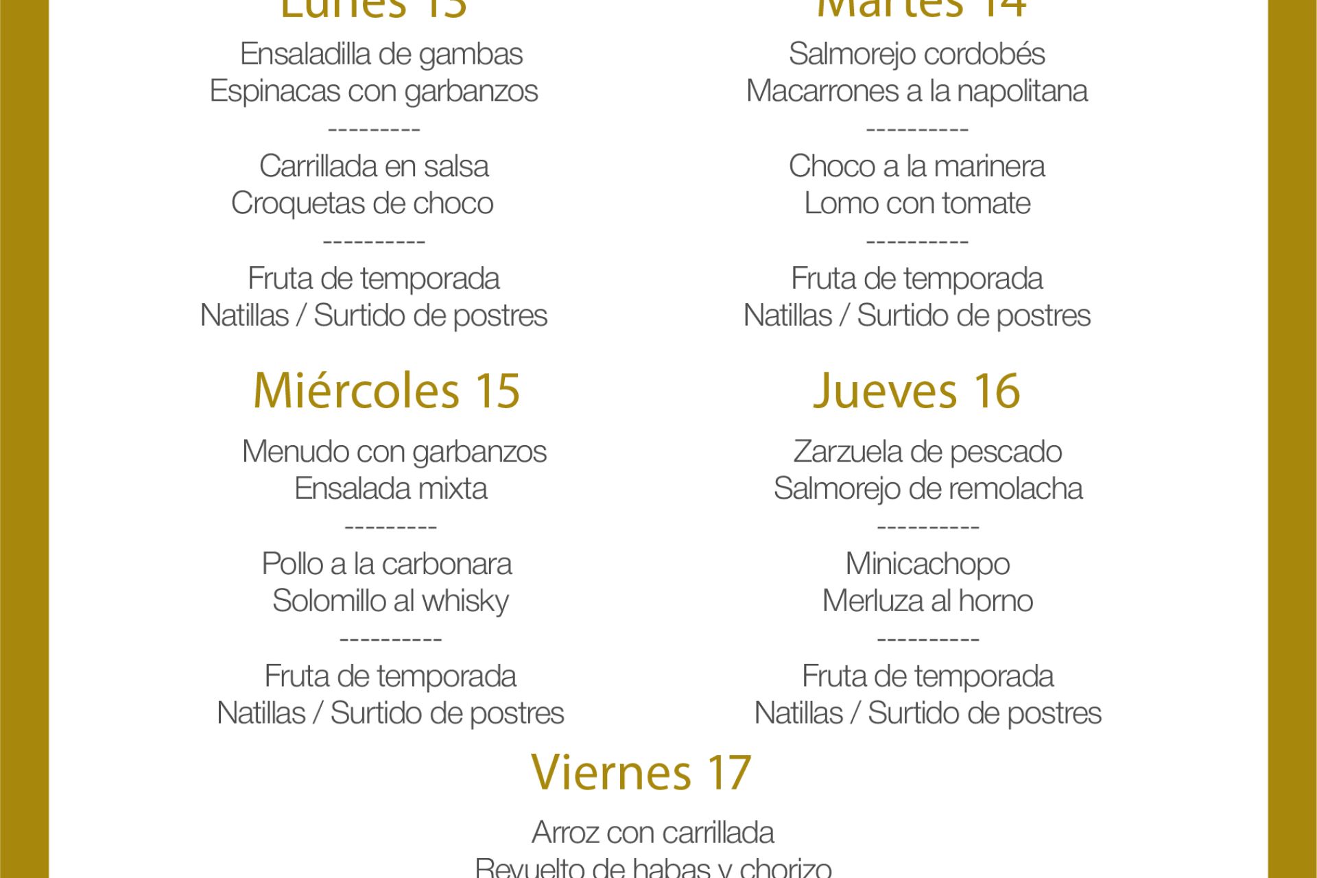 Disponible a mediodía en la cafetería del salón social desde el lunes 17 al viernes 21 de noviembre al precio de 10€/persona (IVA, pan/picos y una bebida incluidos).