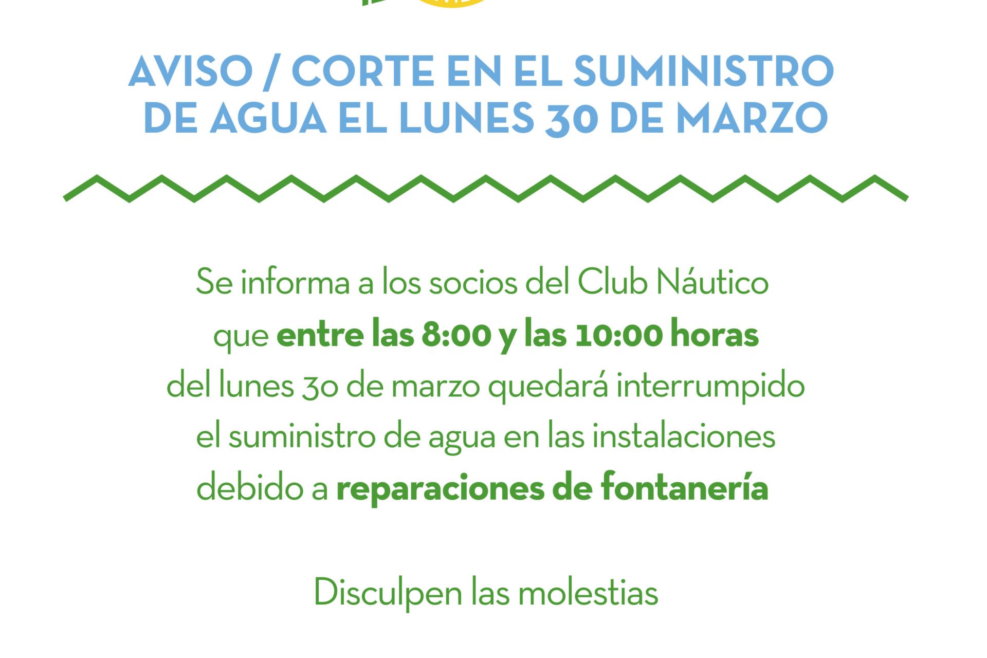 Se informa a los socios del Club Náutico que entre las 8:00 y las 10:00 horas del lunes 30 de marzo quedará interrumpido el suministro de agua en las instalaciones debido a reparaciones de fontanería.