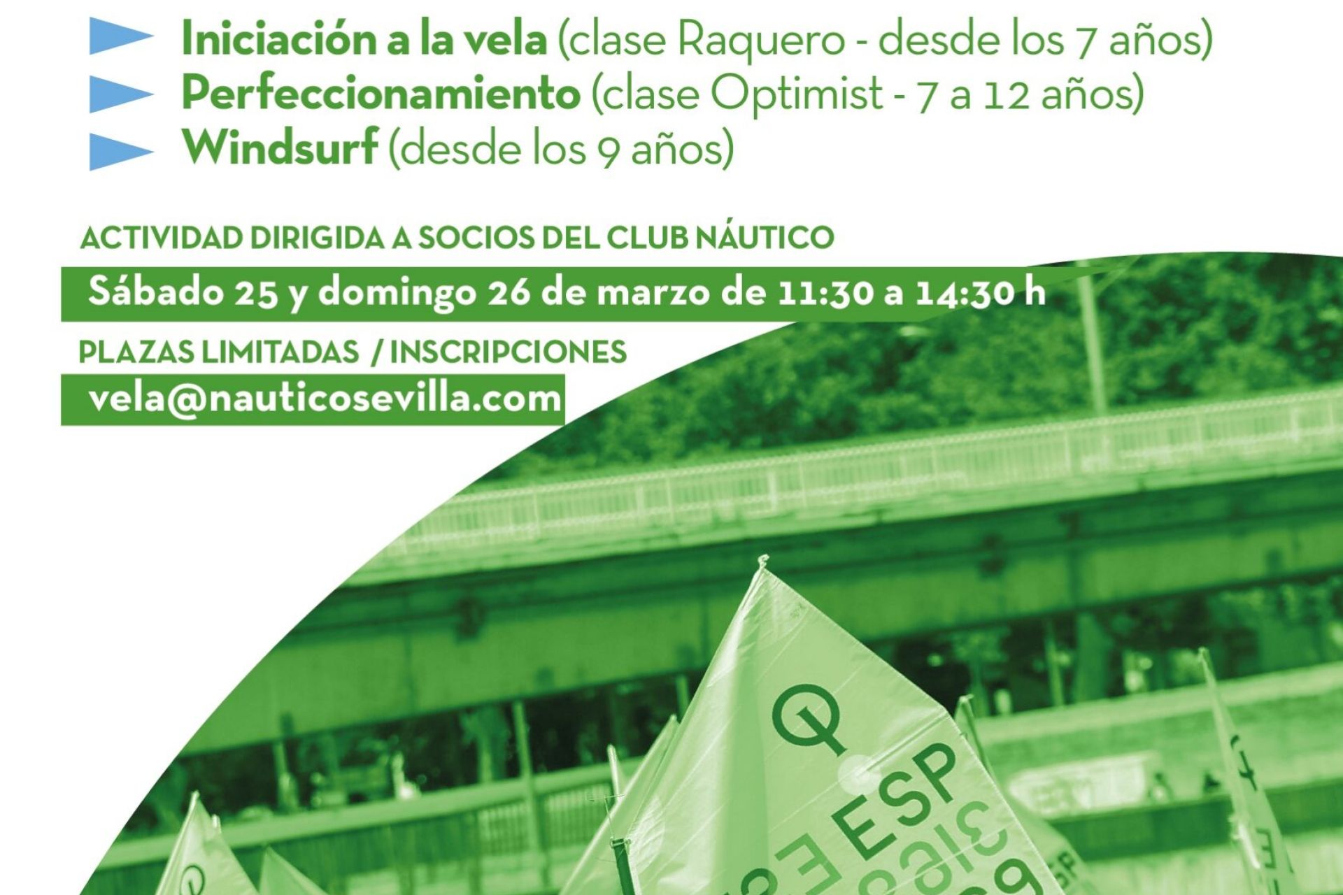 Actividad gratuita dirigida en exclusiva a socios del Club Náutico Sevilla de 7 a 12 años de edad programada el sábado 25 y el domingo 26 de marzo de 11:30 a 14:30 horas. Plazas limitadas. Inscripciones, en vela@nauticosevilla.com