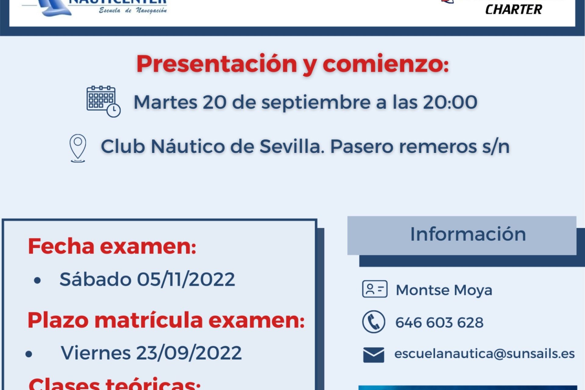 Cursos de Patrón de Embarcaciones de Recreo (PER), Patrón de Navegación Básica (PNB) y PER Reducido. Presentación y comienzo, martes 20 de septiembre a las 20:00 h en el Club Náutico Sevilla. Examen, el 5 de noviembre. Matrícula, hasta el 23 de septiembre. Clases teóricas, martes y jueves de 20:00 a 22:00 h. Más información y contacto: 646 603 628 – escuelanautica@sunsails.es