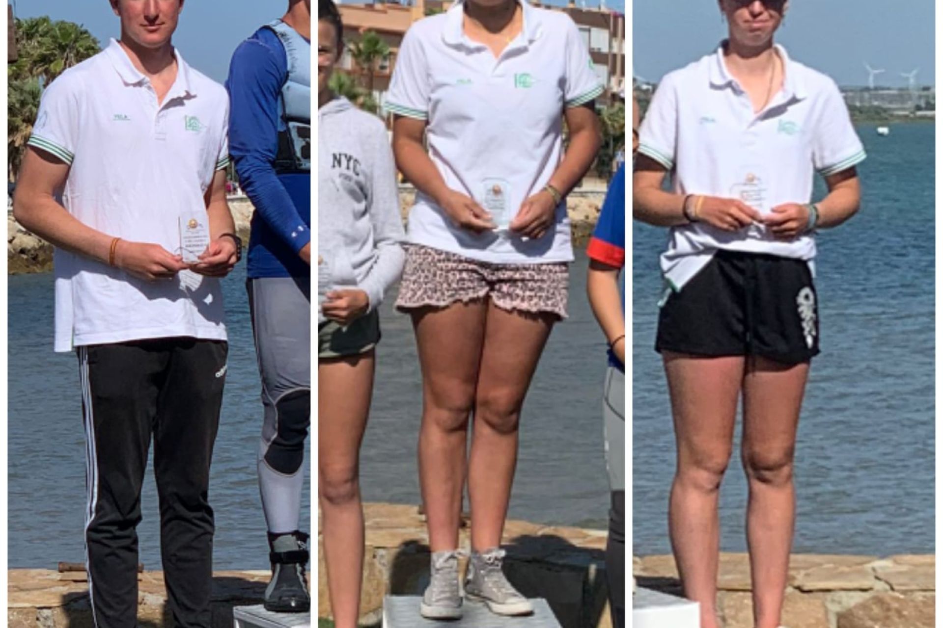 El windsurfista del Club Náutico Sevilla Gonzalo Díaz, campeón en Techno sub15; Arancha Sahuquillo, plata en iQFoil sub17, y Lucía García-Cubillana, bronce en iQFoil sub19.