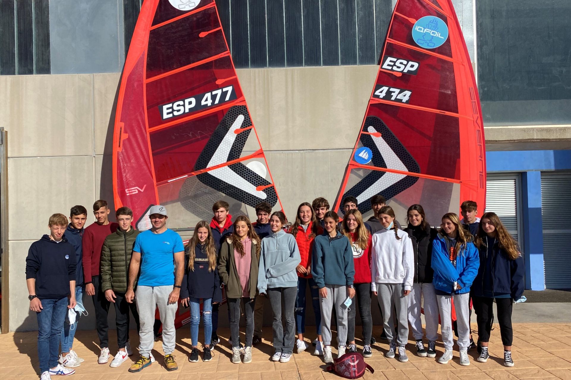 Los windsurfistas juveniles del Club Náutico Sevilla Antonio Cueto, Arancha y Carmen Sahuquillo, Pilar Samalea y Lucía García-Cubillana y el técnico Ricardo Carracedo, convocados por la FAV en Puerto Sherry.
