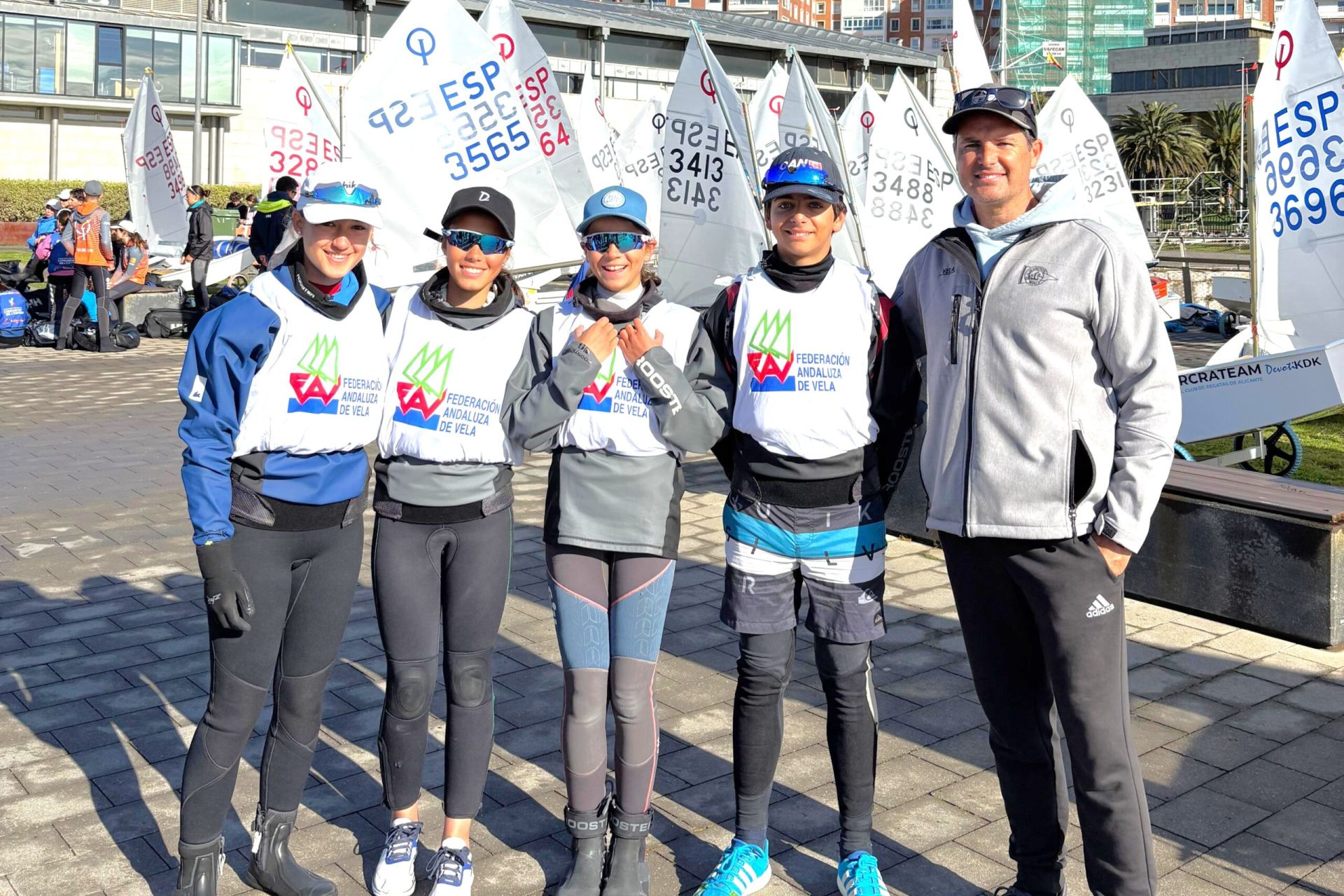 Cuarteto del Club Náutico Sevilla junto al técnico Curro Casado en Santander, con Petra Murube (11ª sub13) y los sub16 Elena Delgado (30ª), María de las Mercedes Medel (36ª) y Miguel Ángel Cervantes (51º).