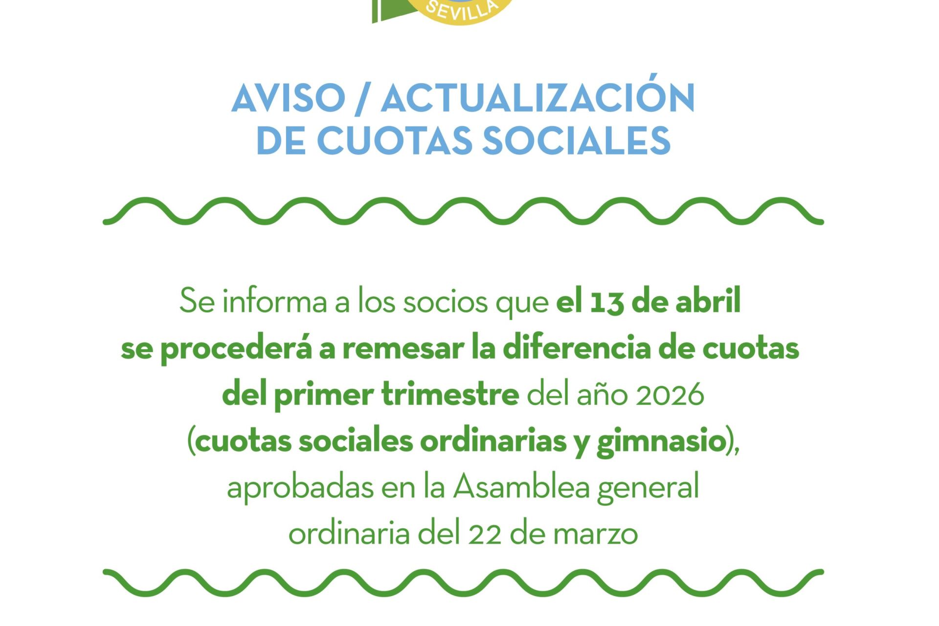 Se informa a los socios que el próximo lunes, 13 de abril, se procederá a remesar la diferencia de cuotas del primer trimestre del año 2026 (cuotas sociales ordinarias y gimnasio), aprobadas en la Asamblea general ordinaria del 22 de marzo.