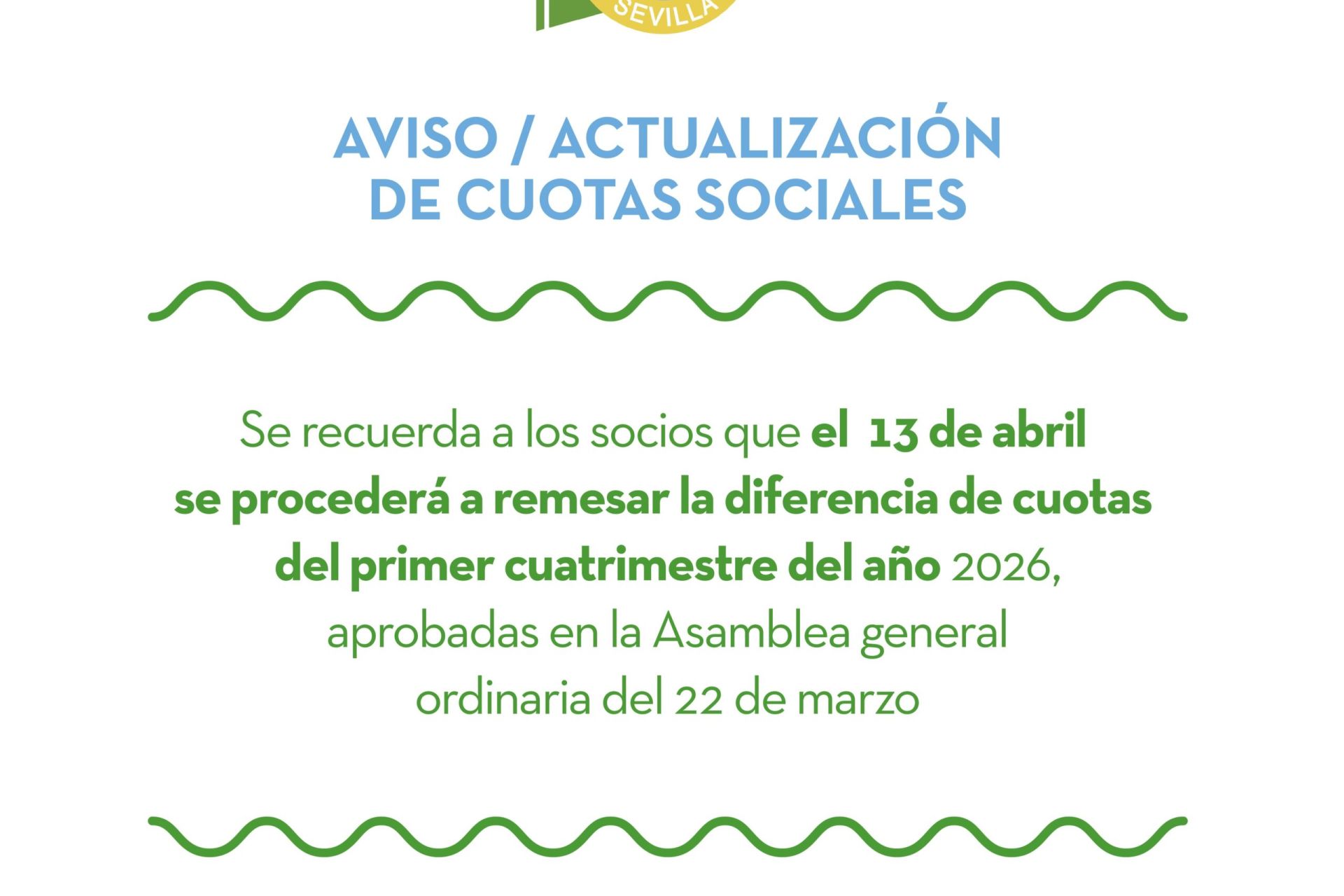 Se informa a los socios que el próximo 13 de abril se procederá a remesar la diferencia de cuotas del primer cuatrimestre del año 2026, aprobadas en la Asamblea general ordinaria del 22 de marzo.