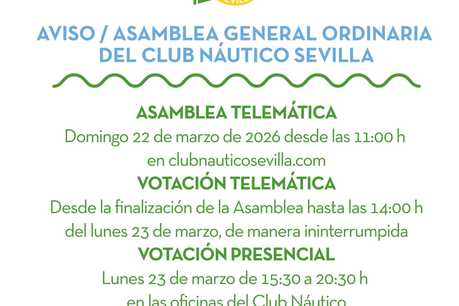 Sigue en directo el desarrollo del acto, presencial y telemático, de este domingo, 22 de marzo, a partir de las 11:00 horas en primera convocatoria o de las 11:15 horas en segunda convocatoria: clubnauticosevilla.com/asamblea