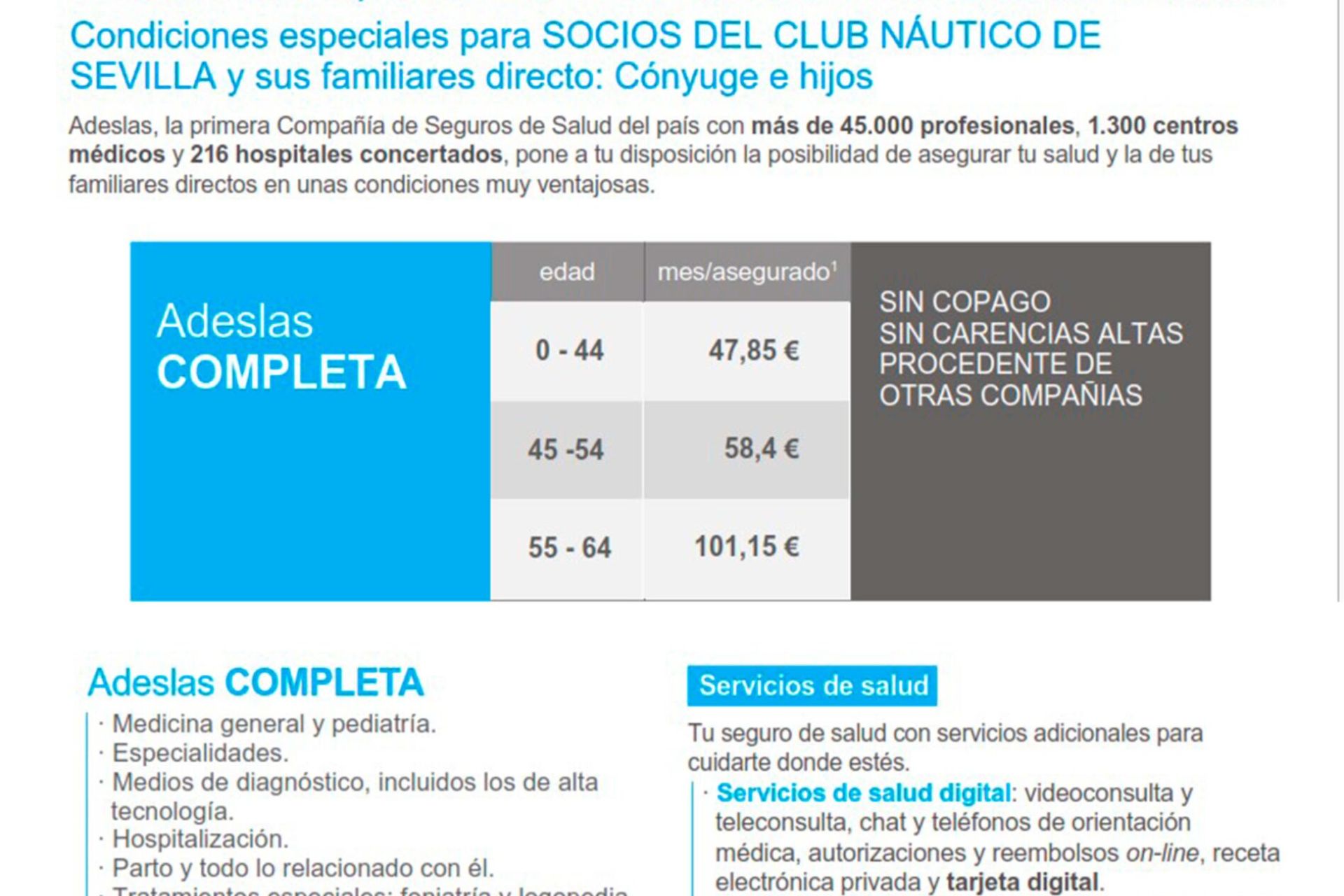 Condiciones especiales en servicios de salud para socios y familiares directos del Club Náutico Sevilla.