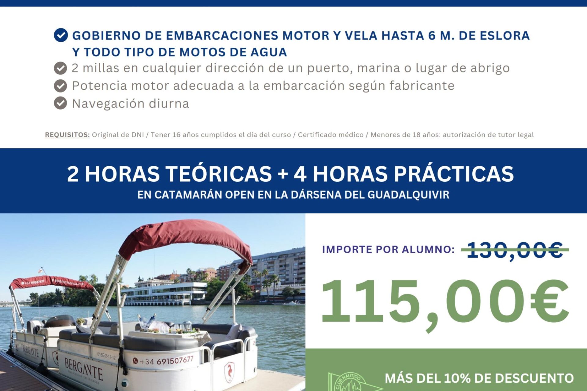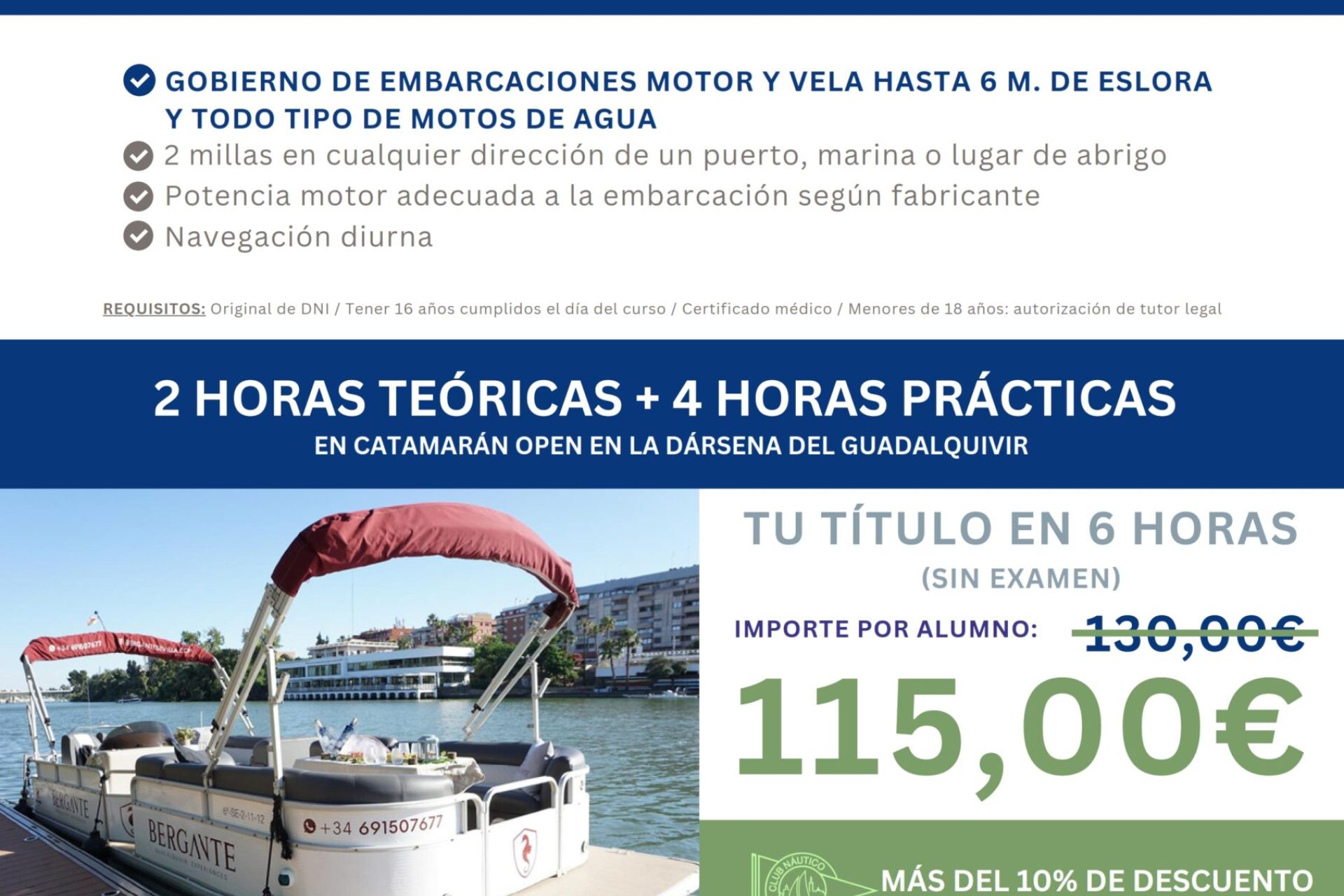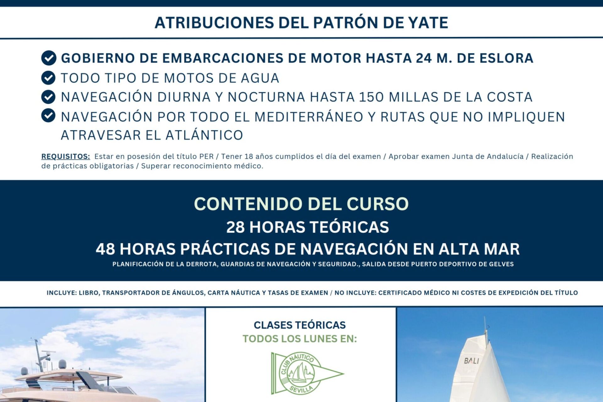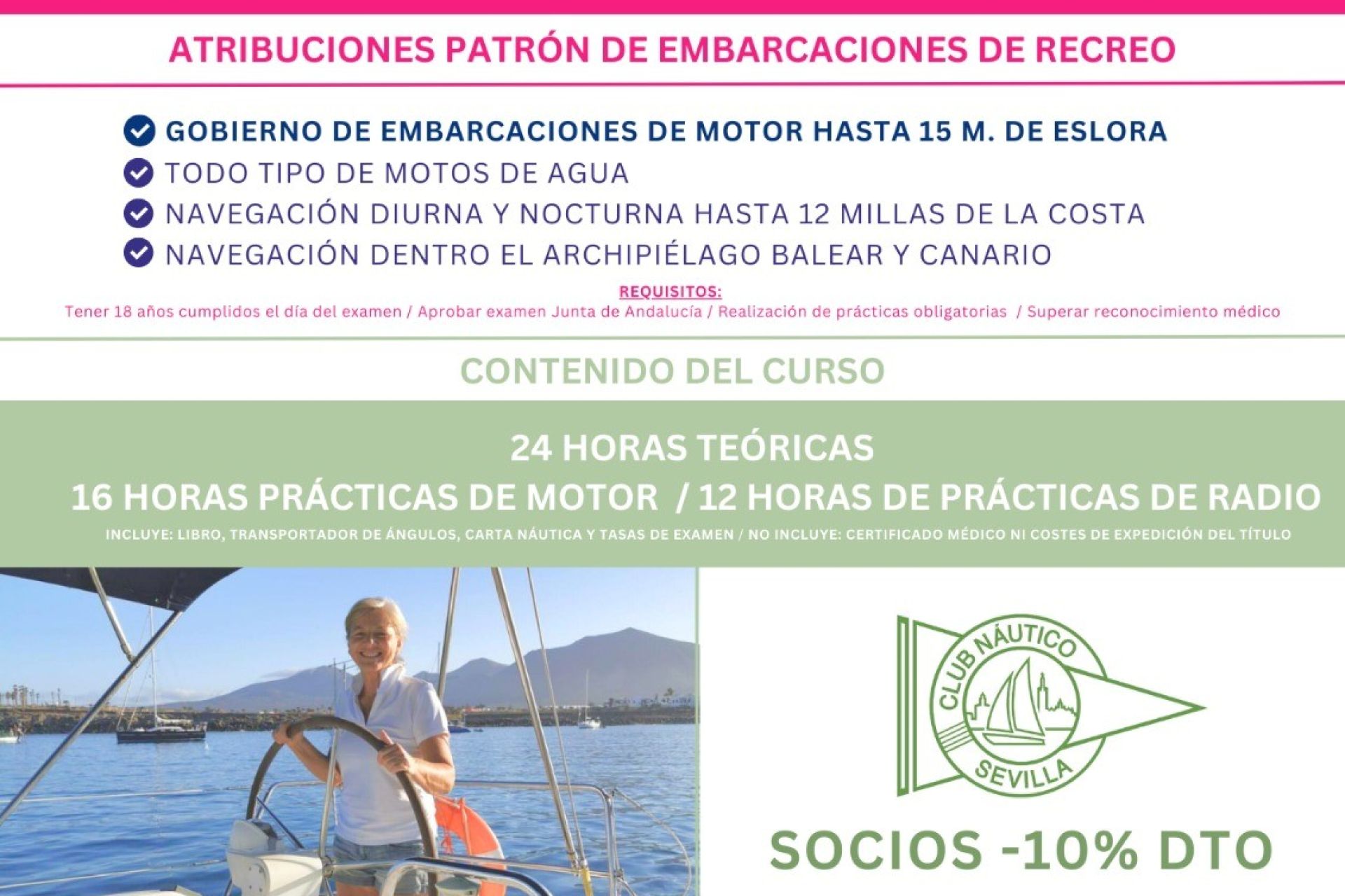 Curso para embarcaciones a motor de hasta 24 metros de eslora y todo tipo de motos de agua impartido de forma presencial, los lunes de 20:00 a 22:00 h a partir del 10 de marzo, por la Escuela Náutica Sevilla Sun Sails Yachts, con descuento para socios.
