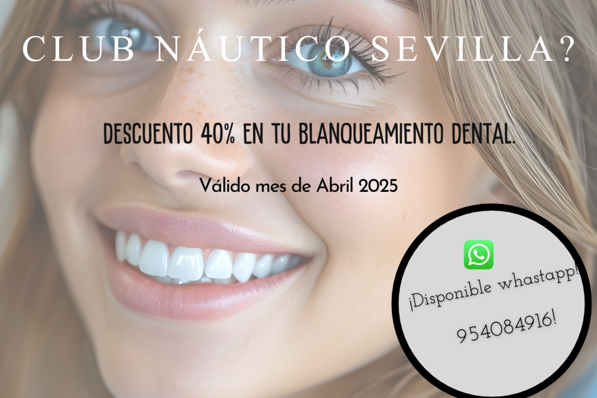 Si eres socio o trabajador del Club Náutico, durante el mes de abril puedes disfrutar de un descuento del 40% en blanqueamiento dental en la clínica ubicada en Virgen de Luján 11. Pide tu cita en el 954 084 916.