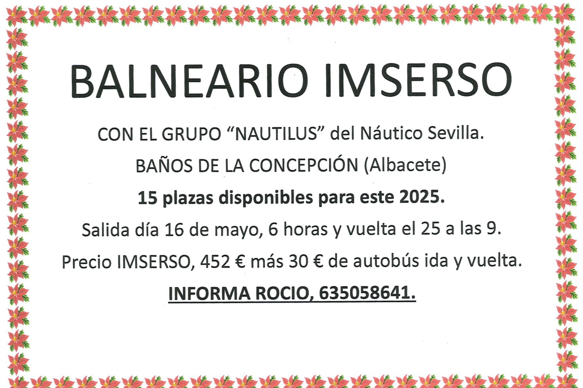 Actividad del IMSERSO dirigida a socios jubilados/pensionistas programada del 16 al 25 de mayo que incluye pensión completa (10 días y 9 noches/452€) y autobús (ida/vuelta, 30€). Plazas limitadas (15).