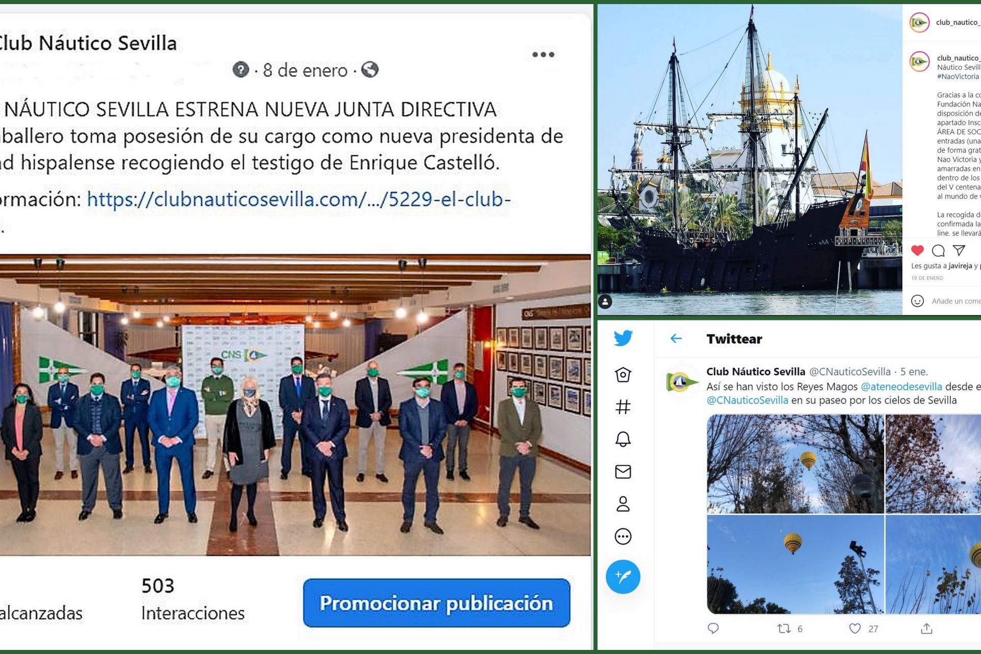 El Club Náutico Sevilla ofrece a sus socios la posibilidad de estar al tanto de todo lo relacionado con la entidad a través de su portal web (clubnauticosevilla.com) y, como no puede se de otra forma, de las redes sociales. El pulso diario de cuanto acontece en el Náutico puede seguirse a través de hasta siete canales o herramientas de comunicación. Y es que, al margen de la plataforma web, en cuya portada se inserta el acceso al boletín de noticias o Newsletter, con 6.952 destinatarios, y el canal de YouTube, que cuenta con casi dos centenares de suscriptores, cuatro son los medios regulares de información, con un acumulado de más de 11.500 seguidores.