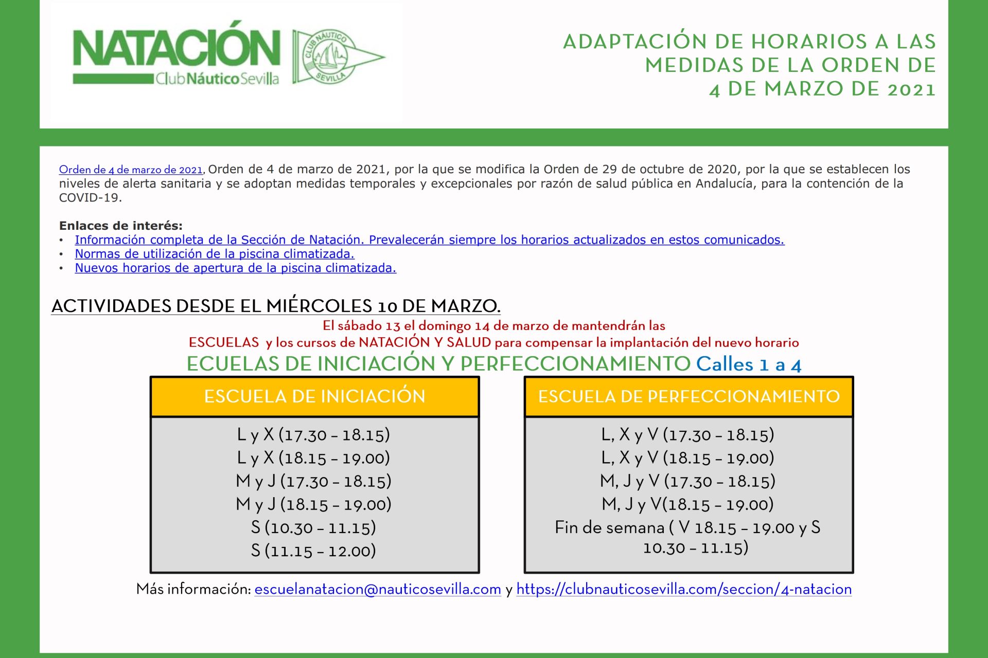 En adaptación a las normativas publicadas el 4 de marzo por la Junta de Andalucía, reajuste organizativo de las actividades de la sección de natación en los diferentes itinerarios deportivos y servicios al socio.