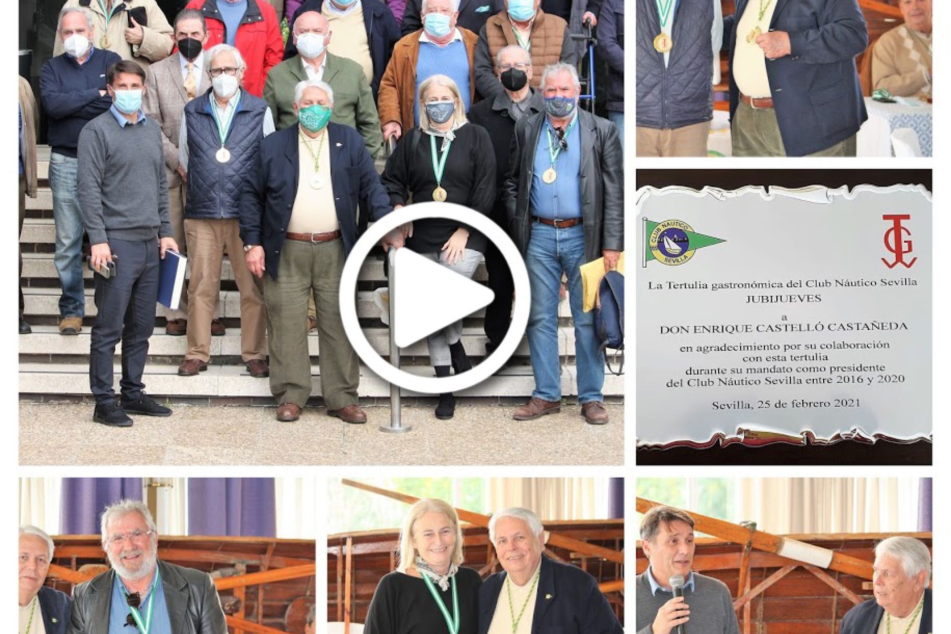 La tertulia gastronómica para jubilados, presidida desde el pasado año por Antonio Garay, aprovechaba la ocasión para rendir su particular reconocimiento a Enrique Castelló, que a finales de 2020 dejaba la presidencia de la entidad hispalense. En agradecimiento por su colaboración durante su mandato, iniciado en 2016, el ya expresidente náutico recibía por ello una placa conmemorativa.
