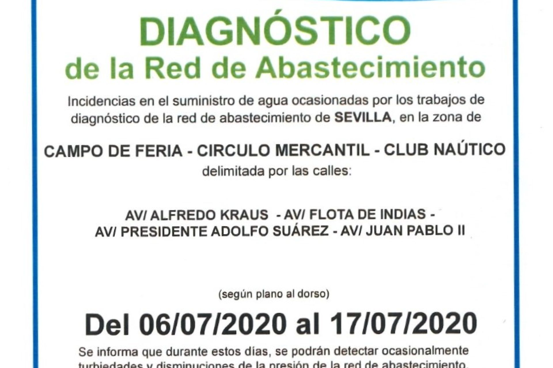 Del 6 al 17 de julio y por trabajos de mantenimiento de EMASESA, se podrán detectar ocasionalmente turbiedades y disminución de la presión de la red de abastecimiento.