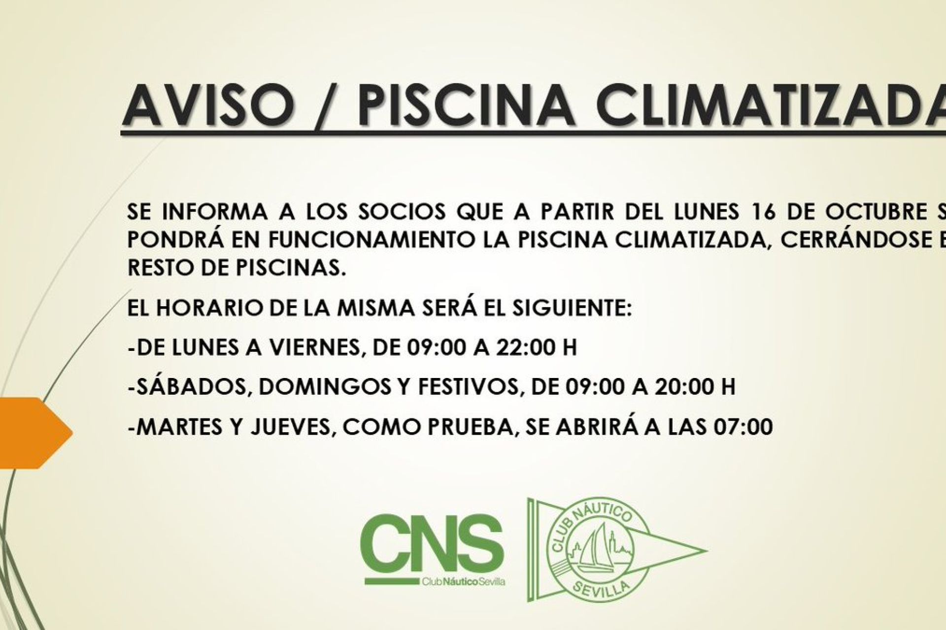 Le recordamos que el Club Náutico abre sus puertas a las 7 de la mañana todos los martes, miércoles y jueves, salvo festivos, para que los socios puedan ejercitarse desde primera hora en la piscina y el gimnasio.