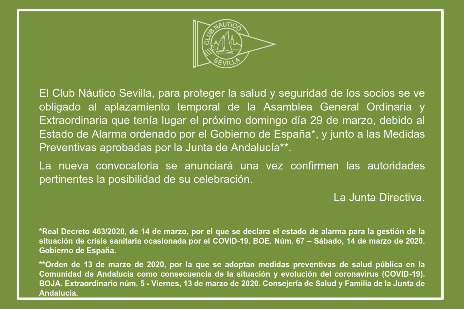 Tras los acontecimientos que estamos viviendo en estos momentos, y tras la declaración el pasado 14 de marzo del Estado de Alarma por parte de del Gobierno de España y las medidas preventivas aprobadas por la Junta de Andalucía, por las que se suspenden hasta el 30 de marzo todas aquellas actividades colectivas en espacios cerrados de más de 300 personas, el Club Náutico Sevilla aplaza temporalmente, y hasta que las autoridades pertinentes lo confirmen, la Asamblea general ordinaria y extraordinaria que se había convocado para el domingo día 29 de marzo de 2020.