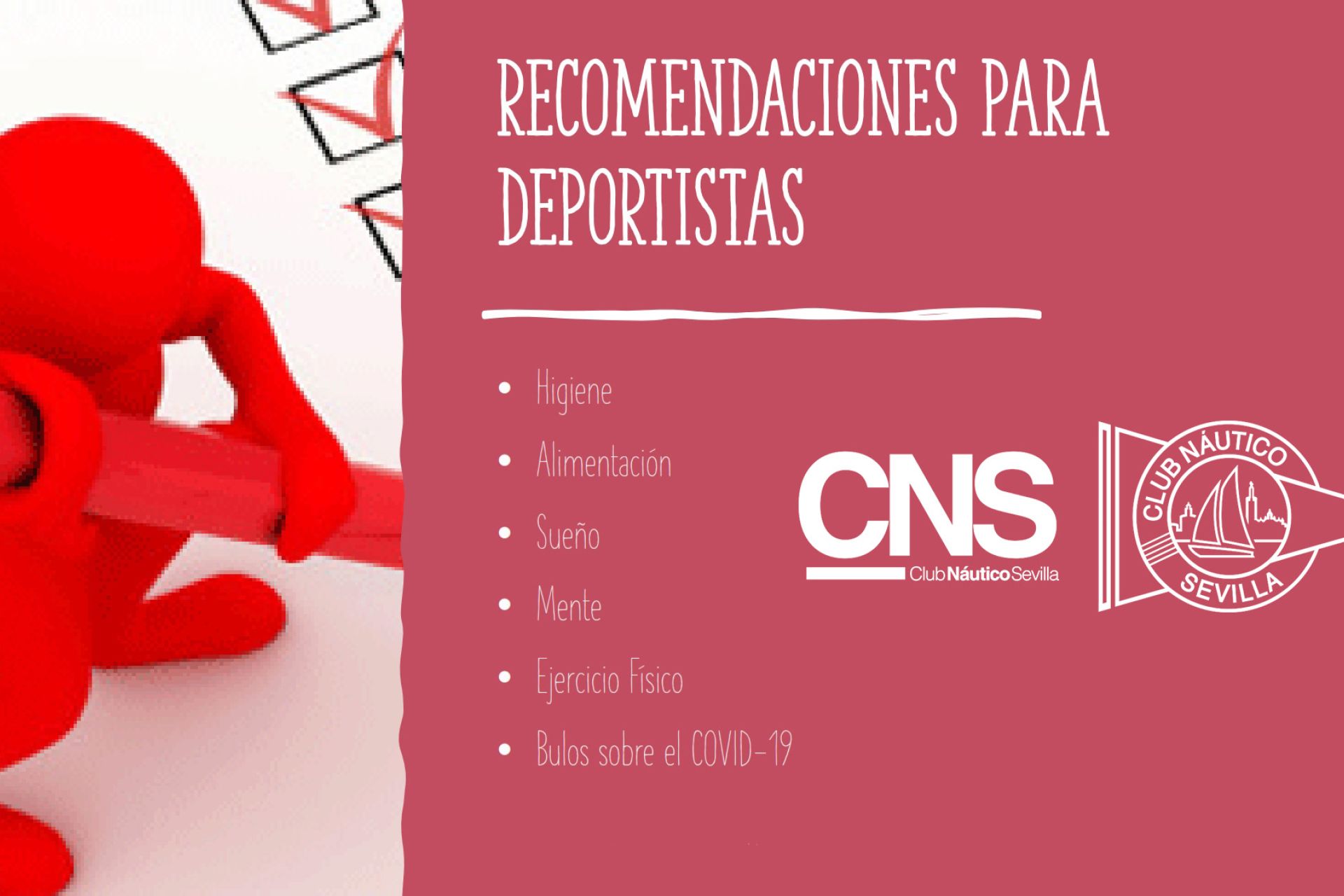 Recomendaciones en materia de higiene, alimentación, sueño, mente y ejercicios físicos facilitadas por la FNCV que trasladamos al cuerpo social y deportistas del Club Náutico, a los que invitamos a compartir sus entrenamientos en casa a través de las redes sociales con las etiquetas #somosnautico #entrenamosencasa #yomequedoencasa #yoentrenoencasa