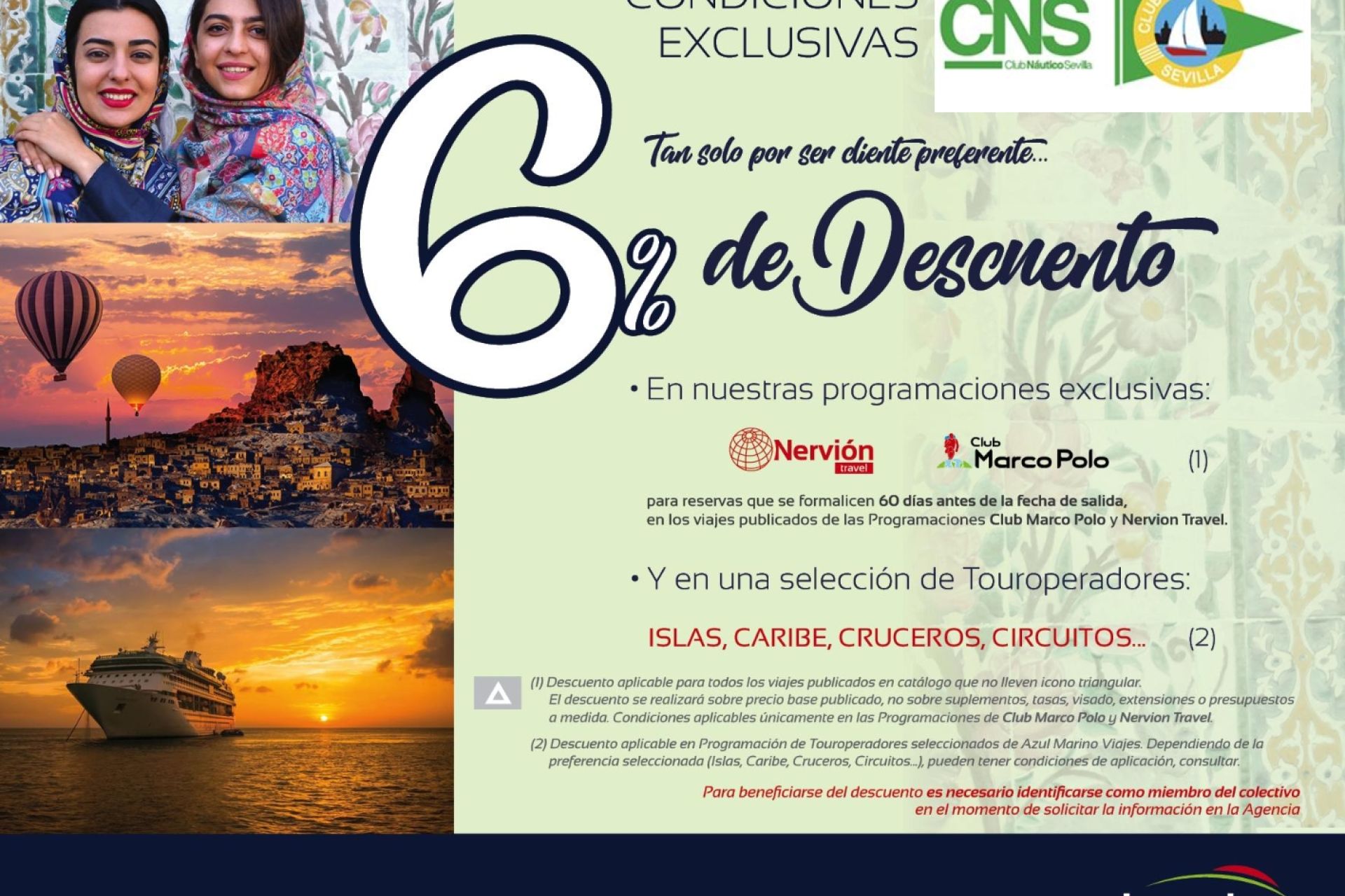Azul Marino Viajes ofrece a los socios del Náutico la posibilidad de beneficiarse de descuentos exclusivos tras el acuerdo de colaboración firmado entre ambas entidades. De esta forma, y previa identificación como socio del Club en el momento de solicitar la información a la agencia, se puede acceder a su amplio abanico de viajes con una aplicación del 6% de bonificación, incluido en las programaciones exclusivas de Azul Marino Viajes, que ofrece destinos exóticos como Vietnam, India, Tailandia, Omán o Sudáfrica, cruceros por el Caribe o el Mediterráneo, viajes de buceo y muchas alternativas.