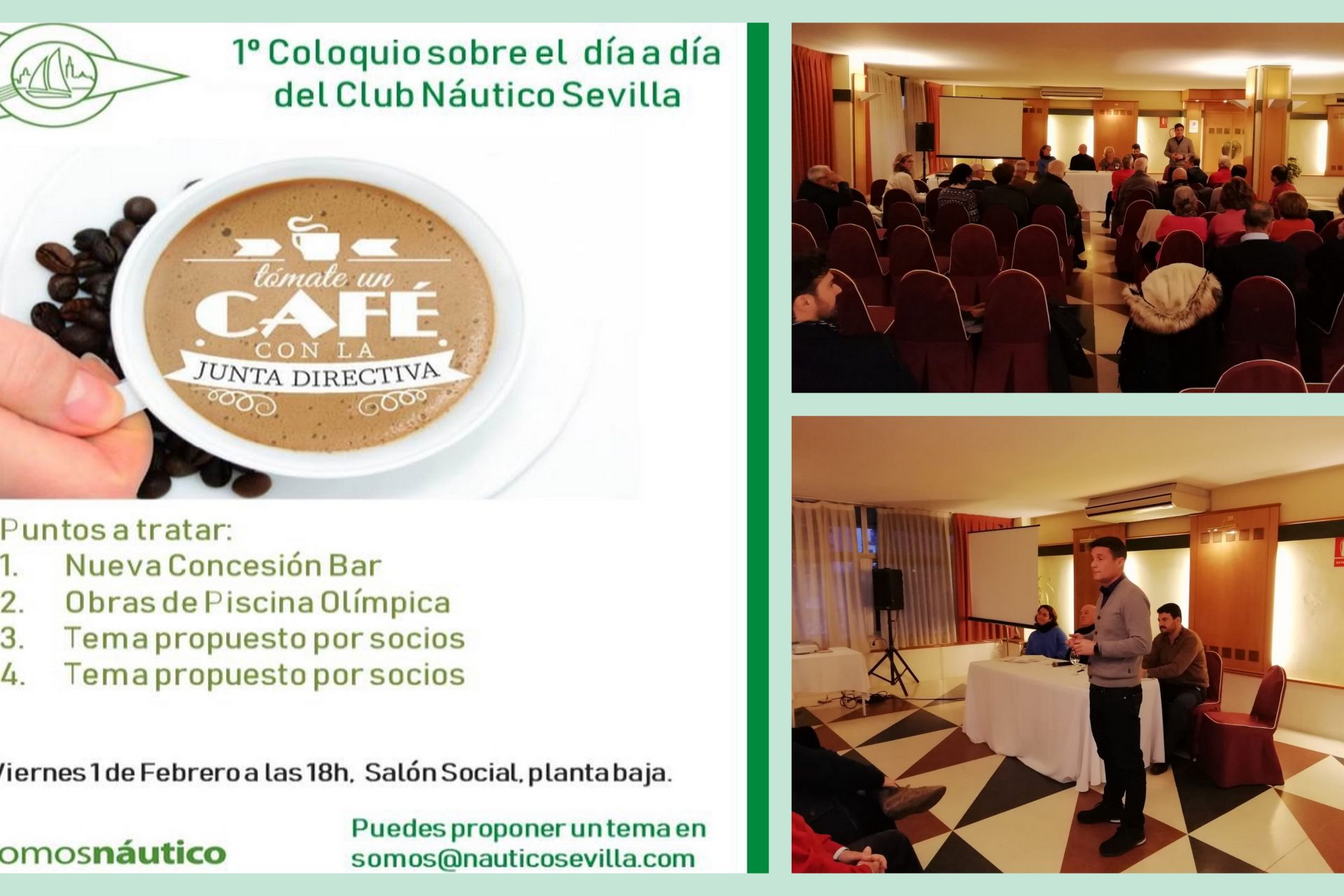 El pasado viernes, día 1 de febrero, quedaron inaugurados en el Club Náutico los coloquios ‘Tómate un café con la Junta Directiva’. Lo hicieron en un acto mediante el cual el presidente de la entidad, Enrique Castelló, acompañado por otros miembros de la directiva y el director de Instalaciones, Antonio Moya de la Rubia, tuvo la ocasión de informar de manera distendida sobre temas de interés para los socios que acudieron a la cita después de tomar un café a media tarde de manera conjunta.
